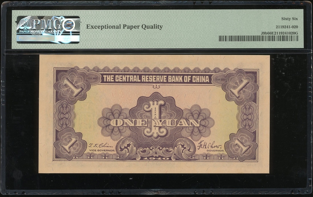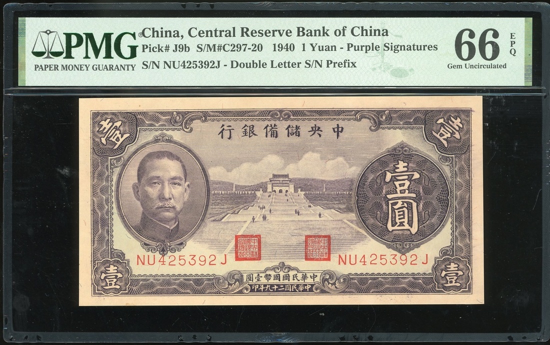 Central Reserve Bank of China, 1 yuan, Year 29(1940), double letter prefix NU425392J, (Pick J9b), PMG 66EPQ Gem Uncirculated, the highest grade in PMG population report.