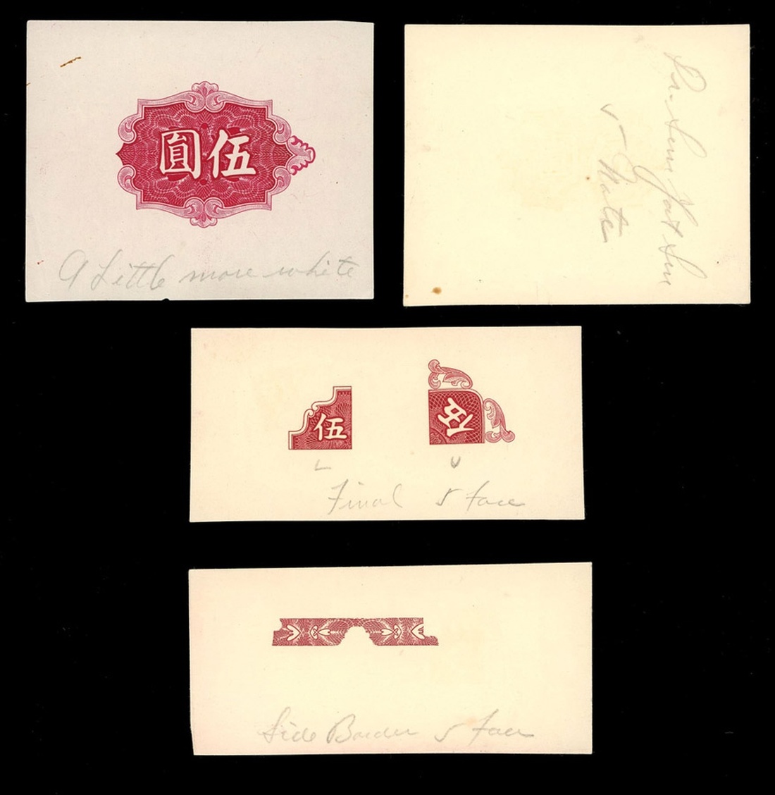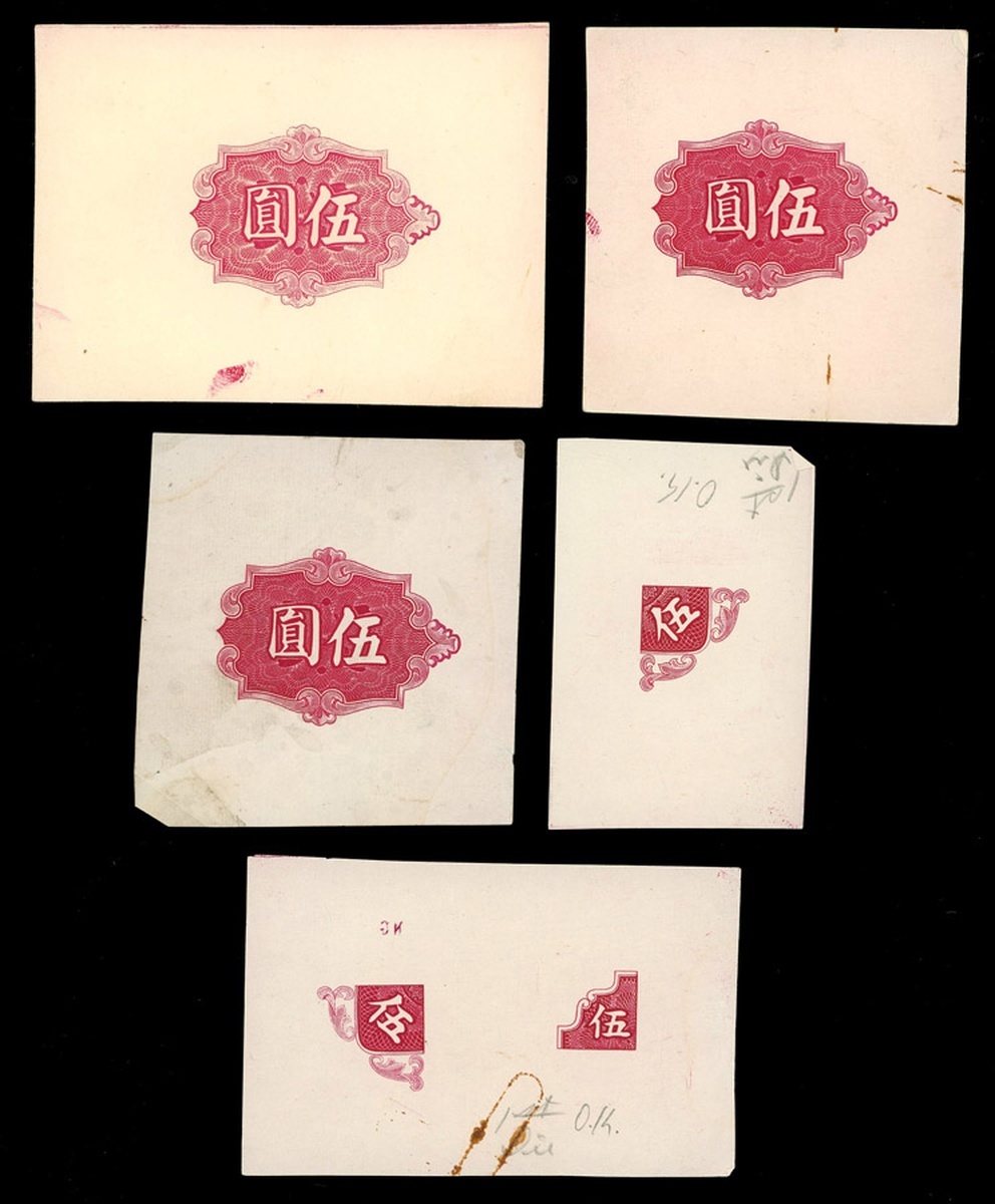 Central Reserve Bank of China, a group of 9 design elements for the red 5 yuan of 1940, mostly of the denomination '5 yuan' in Chinese characters plus some border designs,