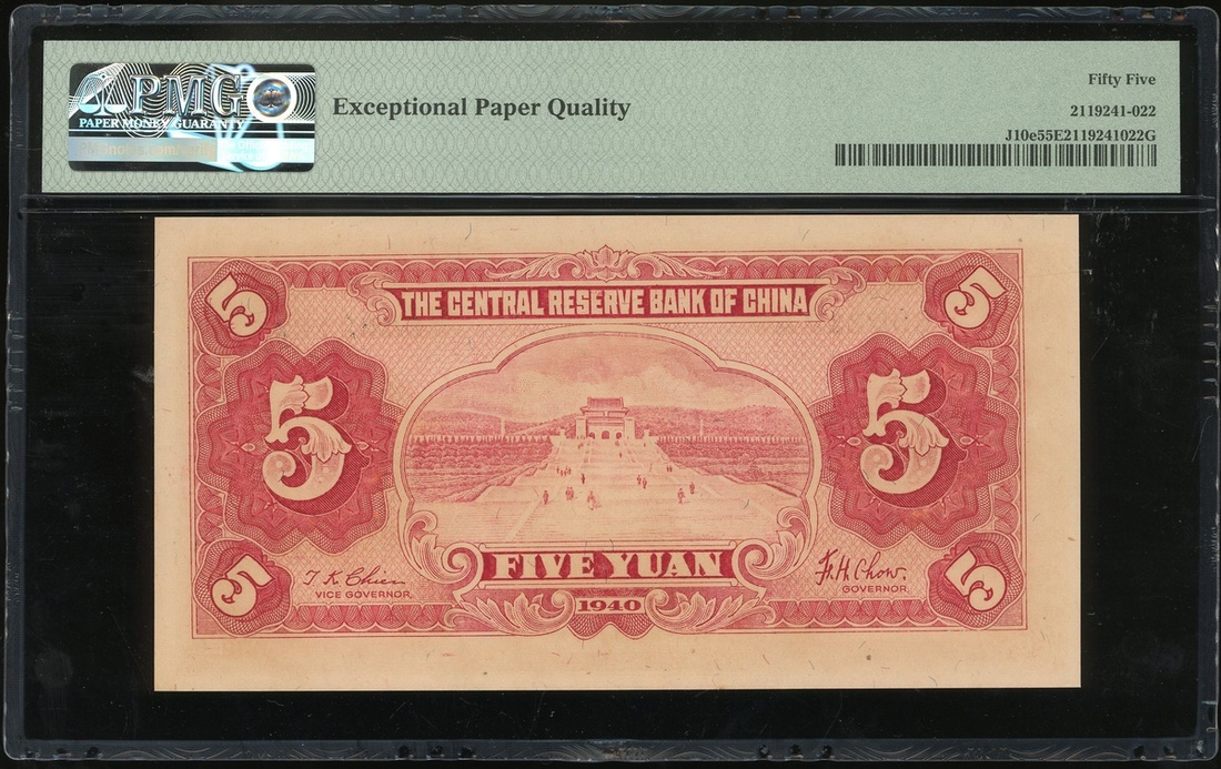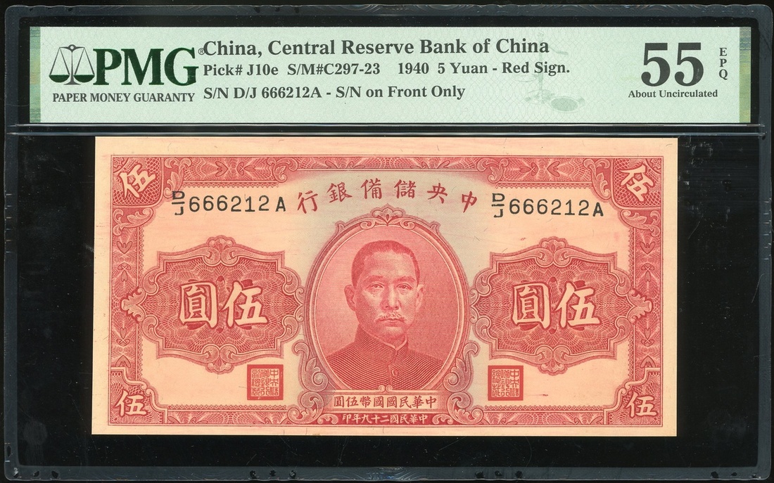 Central Reserve Bank of China, 5 yuan, Year 29(1940), serial number D/J 666212A, (Pick J10e), PMG 55EPQ About Uncirculated.