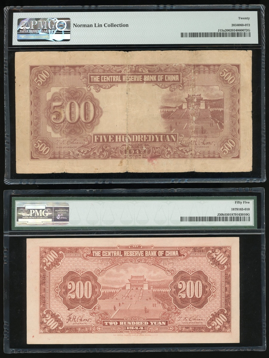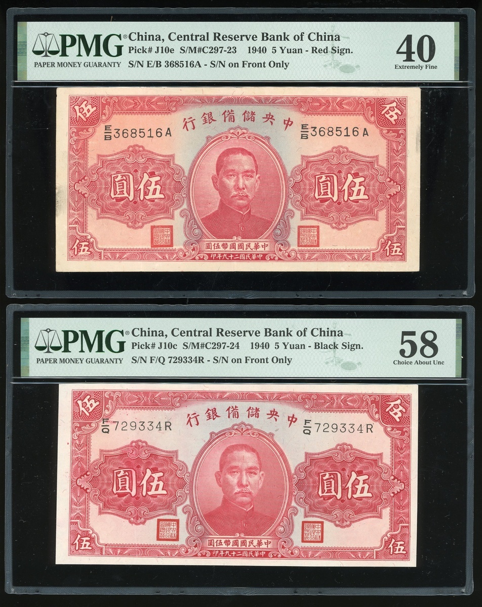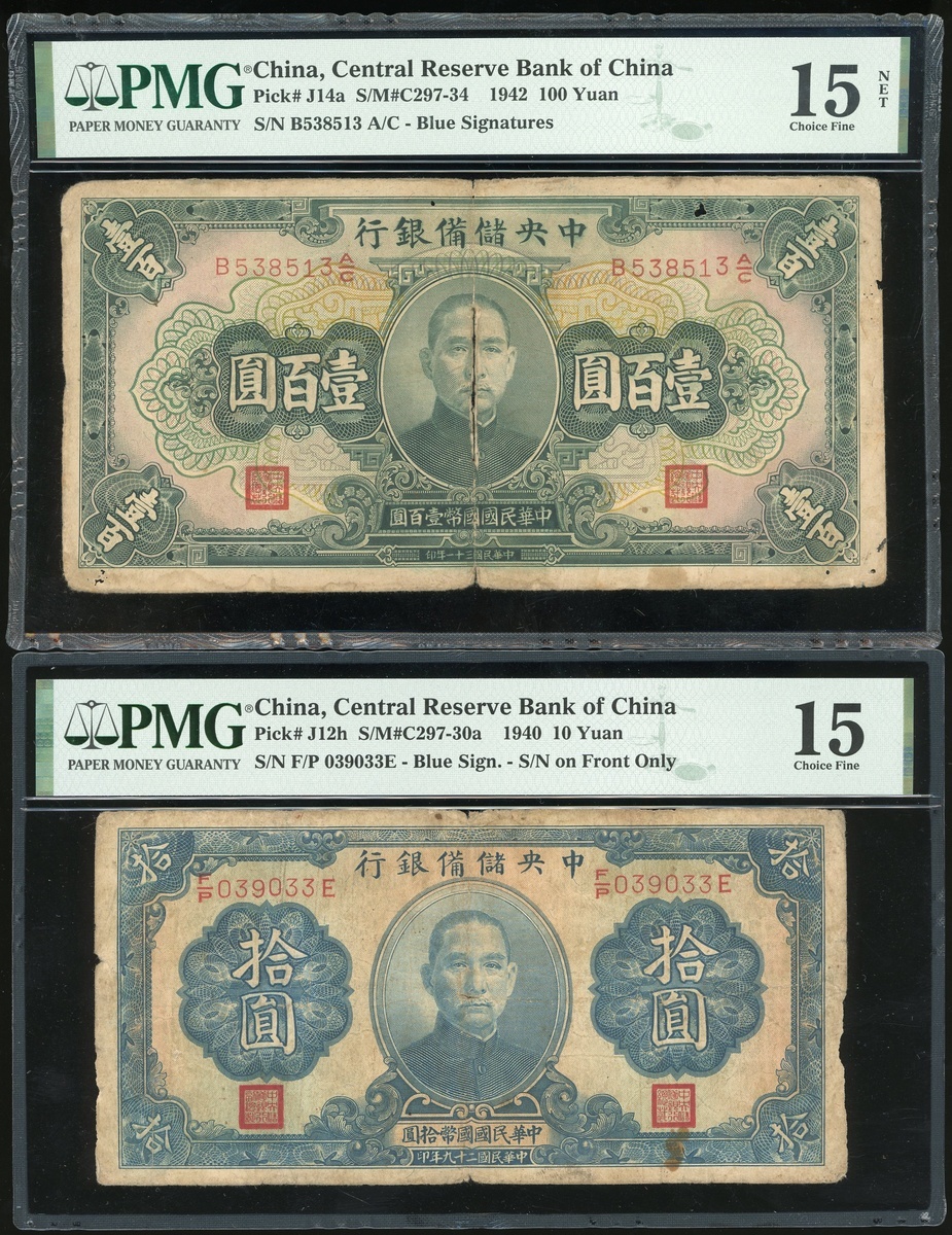 Central Reserve Bank of China, a group of 7 notes, consists of a pair of 5 Yuan, 1940, serial numbers E/B368516A and F/Q729334R, 10 and 100 Yuan, 1940 and 1942, serial numbers F/P039033E and B538513A/C, 200 and 500 Yuan, 1944 and 1942, serial numbers H371559AE and CM174621K/V, brown, Sun Yat-sen at centre,1000 Yuan, 1944, dark blue and multicoloured, Sun Yat-sen at centre, (Pick J10e, J10c, J12h, J14a, J30b, J15a, J32b), graded PMG 40, 58, 15NET(Large Split, Incert Damage) and 15(Rust) respectively, Norman Lin Collection (4)PMG 20 Very Fine-55 About Uncirculated (2)PMG 20NET Very Fine (Paper Damage, Rust)