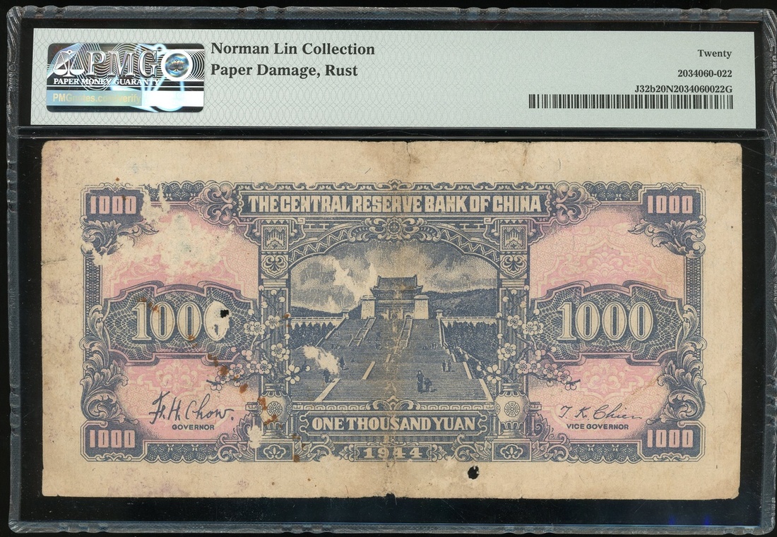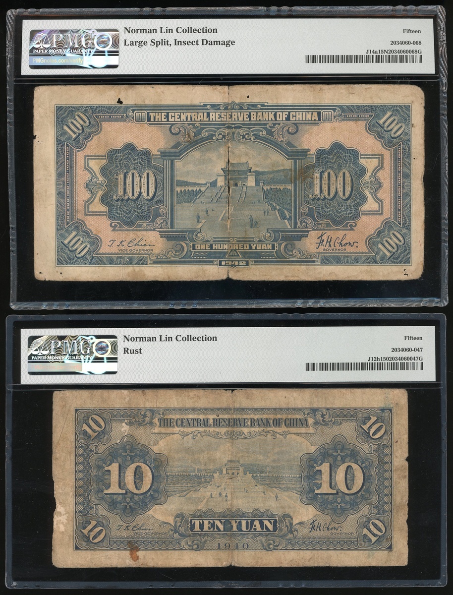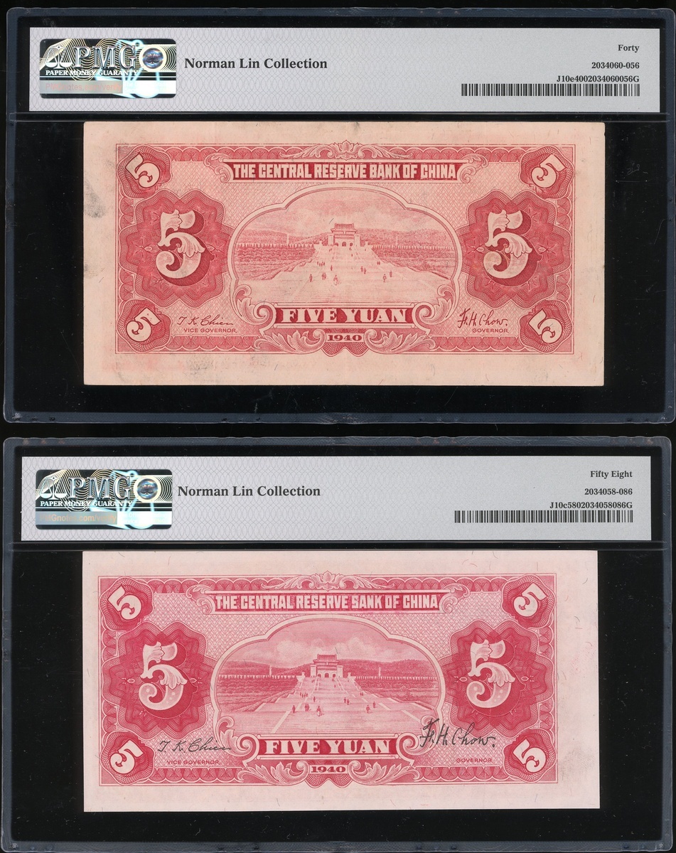 Central Reserve Bank of China, a group of 7 notes, consists of a pair of 5 Yuan, 1940, serial numbers E/B368516A and F/Q729334R, 10 and 100 Yuan, 1940 and 1942, serial numbers F/P039033E and B538513A/C, 200 and 500 Yuan, 1944 and 1942, serial numbers H371559AE and CM174621K/V, brown, Sun Yat-sen at centre,1000 Yuan, 1944, dark blue and multicoloured, Sun Yat-sen at centre, (Pick J10e, J10c, J12h, J14a, J30b, J15a, J32b), graded PMG 40, 58, 15NET(Large Split, Incert Damage) and 15(Rust) respectively, Norman Lin Collection (4)PMG 20 Very Fine-55 About Uncirculated (2)PMG 20NET Very Fine (Paper Damage, Rust)