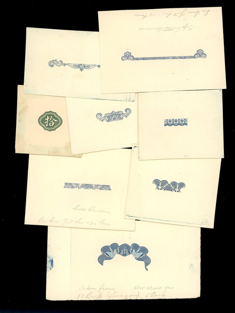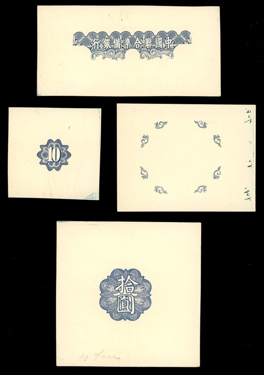 Japanese Puppet Banks: Central Reserve Bank of China/Federal Reserve Bank of China, a group of 15 design elements for 10 yuan, circa 1940's, border and denomination desigins,
