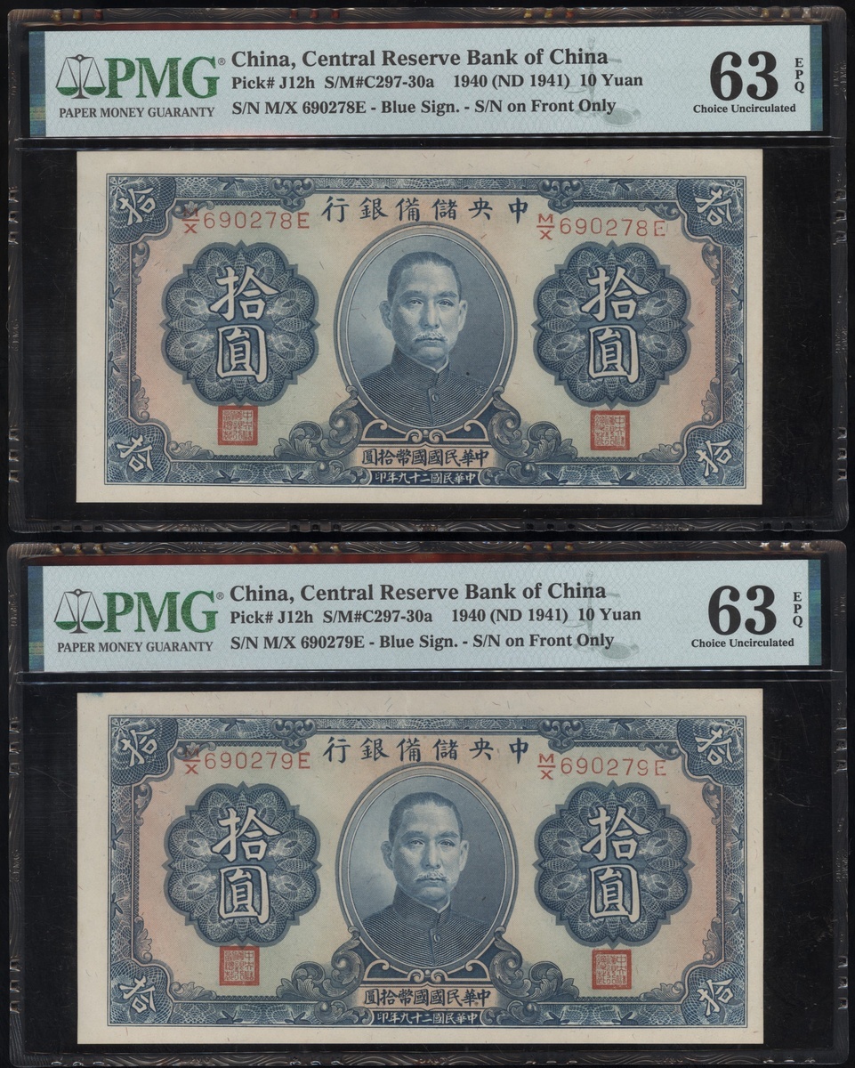 Central Reserve Bank of China, a consecutive group of 7x 10 yuan, Year 29(1930), serial numbers M/X 690274E-280E, (Pick J12h), all graded PMG 63EPQ Choice Uncirculated (7).