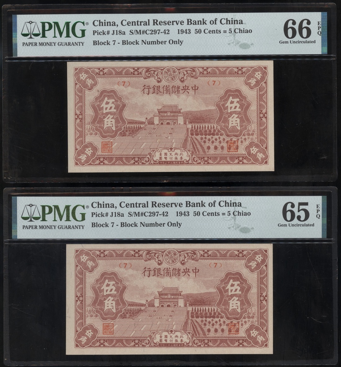 民國三十二年中央儲備銀行伍角一組兩枚,PMG 65-66EPQ