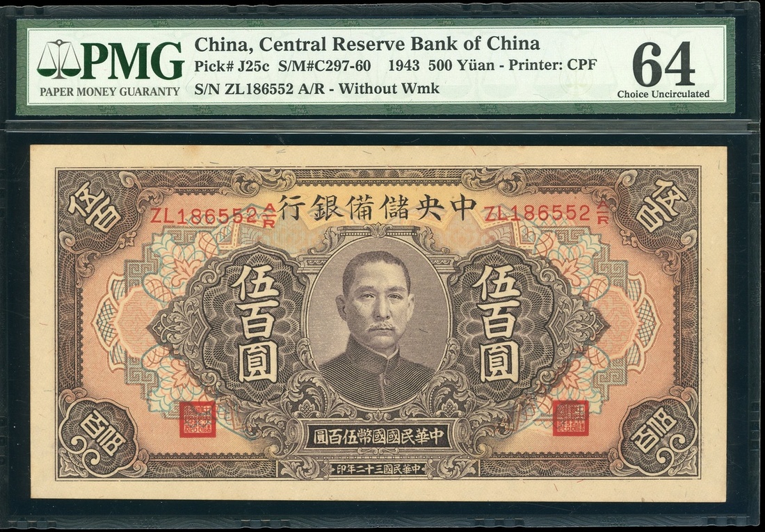 Central Reserve Bank of China, group of 3 notes, 1 yuan, 1943 #AT162263, 10 yuan, 1940 #X/V515663E and 500 yuan, 1943 #ZL186552A/R,