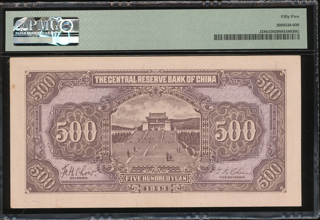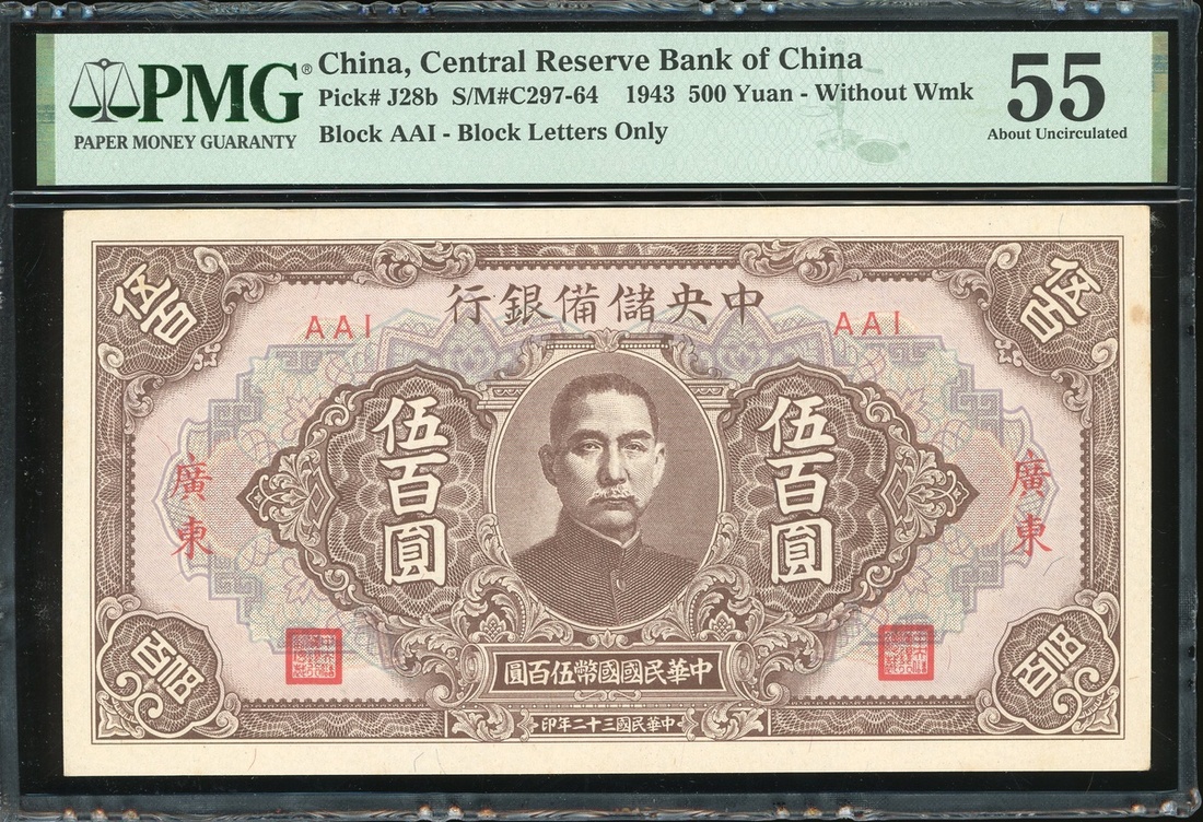 The Central Reserve Bank of China, 500 yuan, Kwangtung, Year 23 (1943), Block serial AAI, (Pick J28b), PMG 55 About Uncirculated