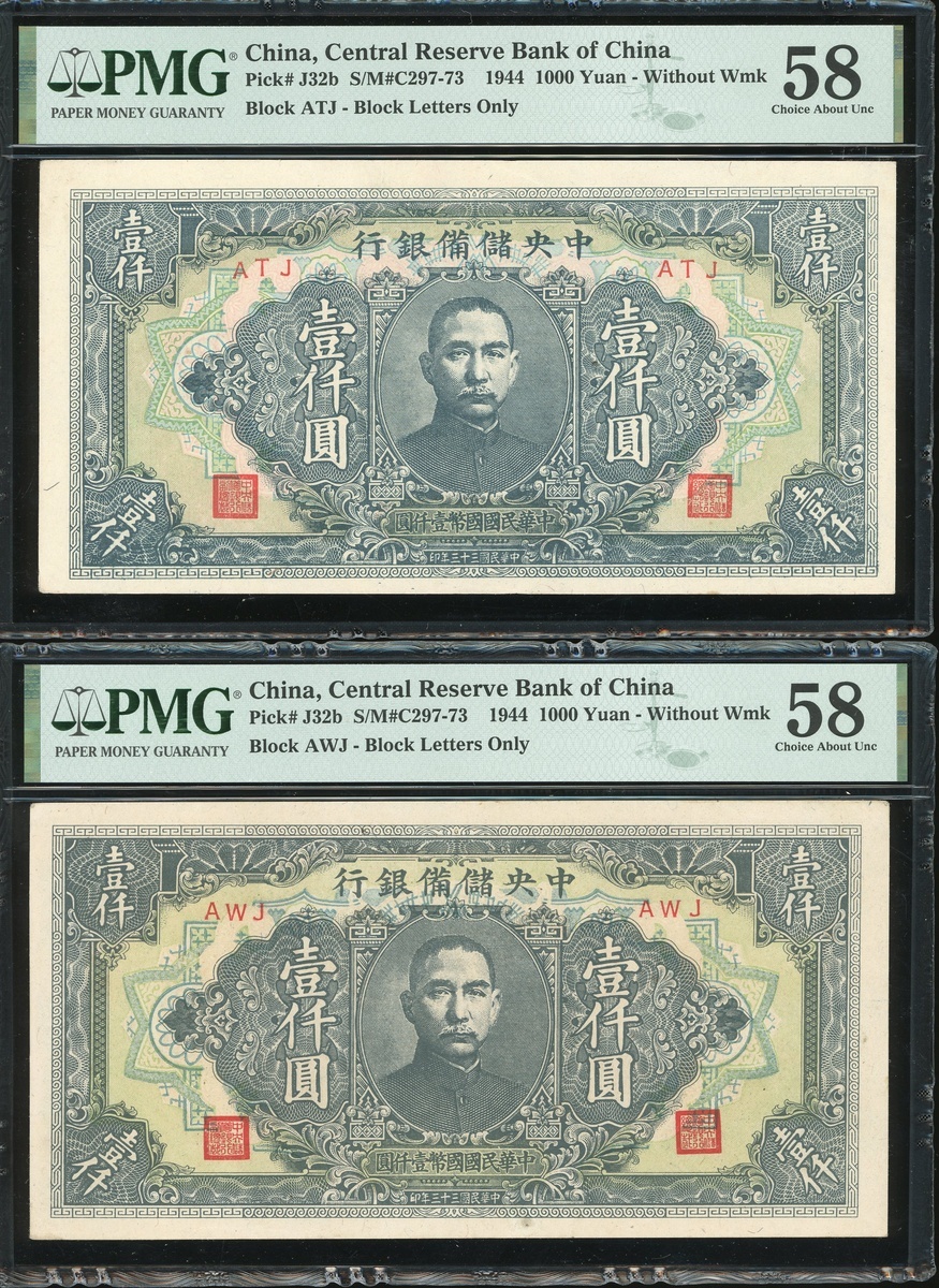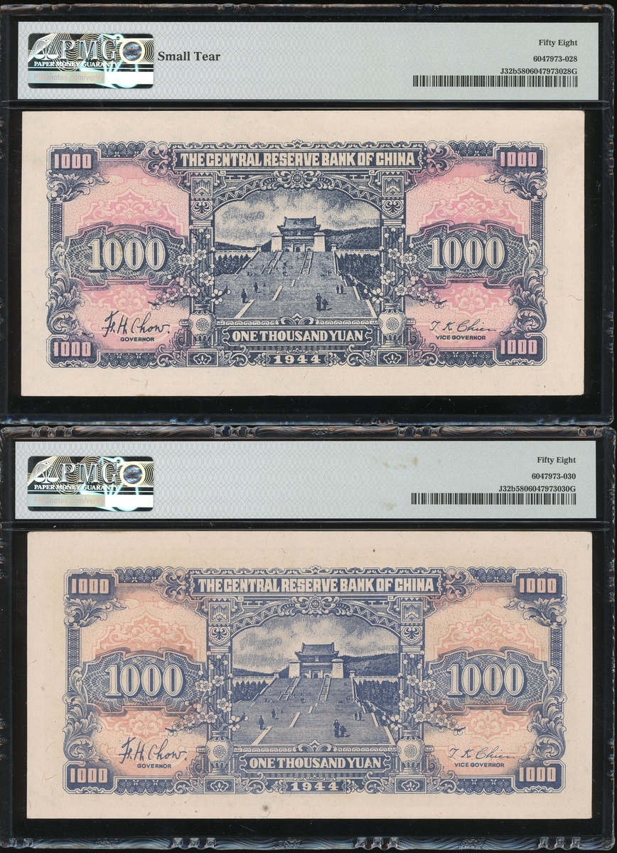 Central Reserve Bank of China, a pair of 1000 yuan, 1944, block number ATJ and AWJ, (Pick J32b), both graded PMG 58 Choice Almost Uncirculated (2)