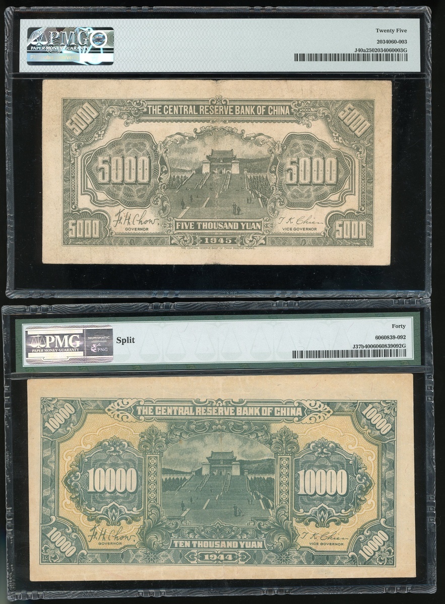 民國三十三及三十四年中央儲備銀行伍仟、壹萬圓各一枚,編號W162205AD及N/D665023J,均PMG 25-40,其中第二枚有裂痕