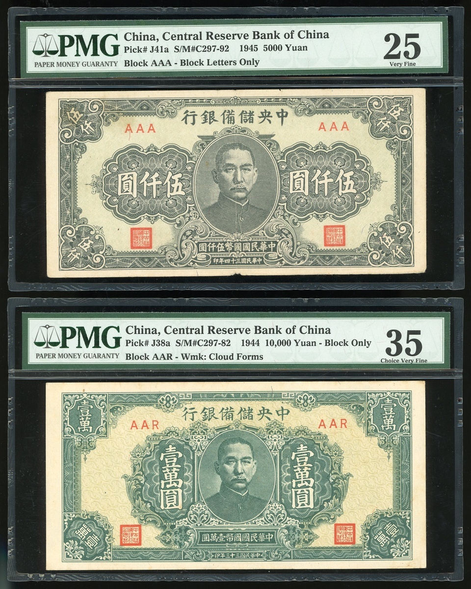 Central Reserve Bank of China, 5,000 and 10,000 Yuan, 1944 and 1945, dark green and pale yellow, Sun Yat-sen at centre, (Pick J38a, J41a), PMG 25 Very Fine-35 Choice Very Fine (2)