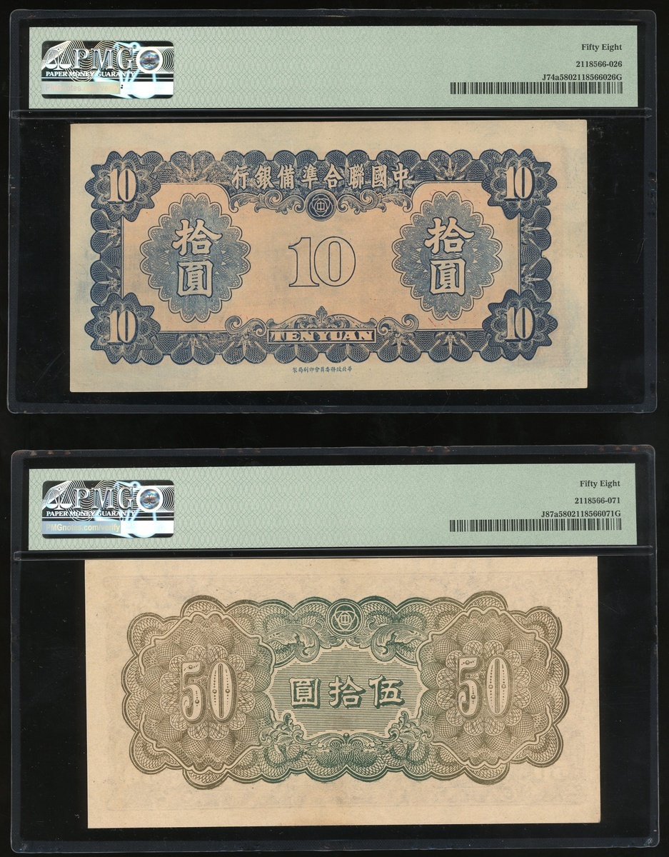1941/45年中國聯合準備銀行10元及50元,編號0212703,組號1,均PMG 58