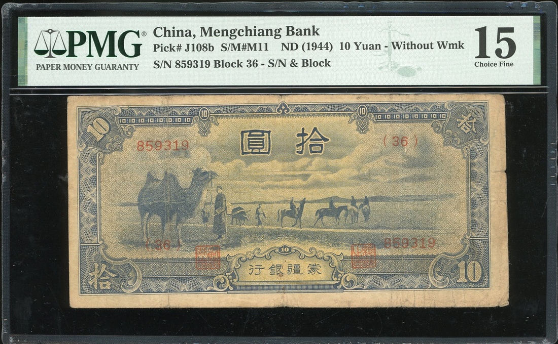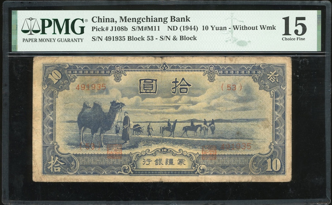 Mengchiang Bank, a pair of 10 yuan, 1944, serial numbers 491935 (53) and 859319 (36), without watermark, (Pick J108b), both graded PMG 15 Choice Fine (2)