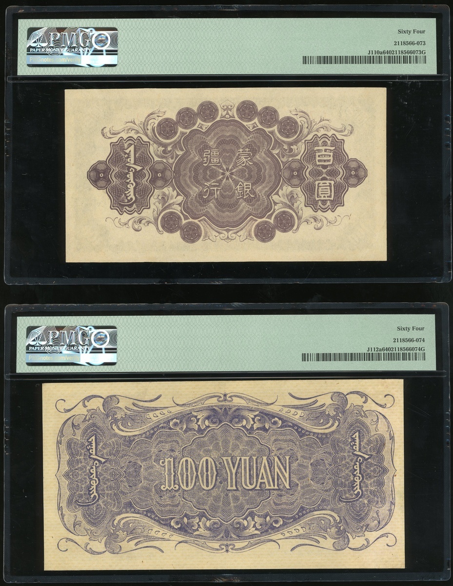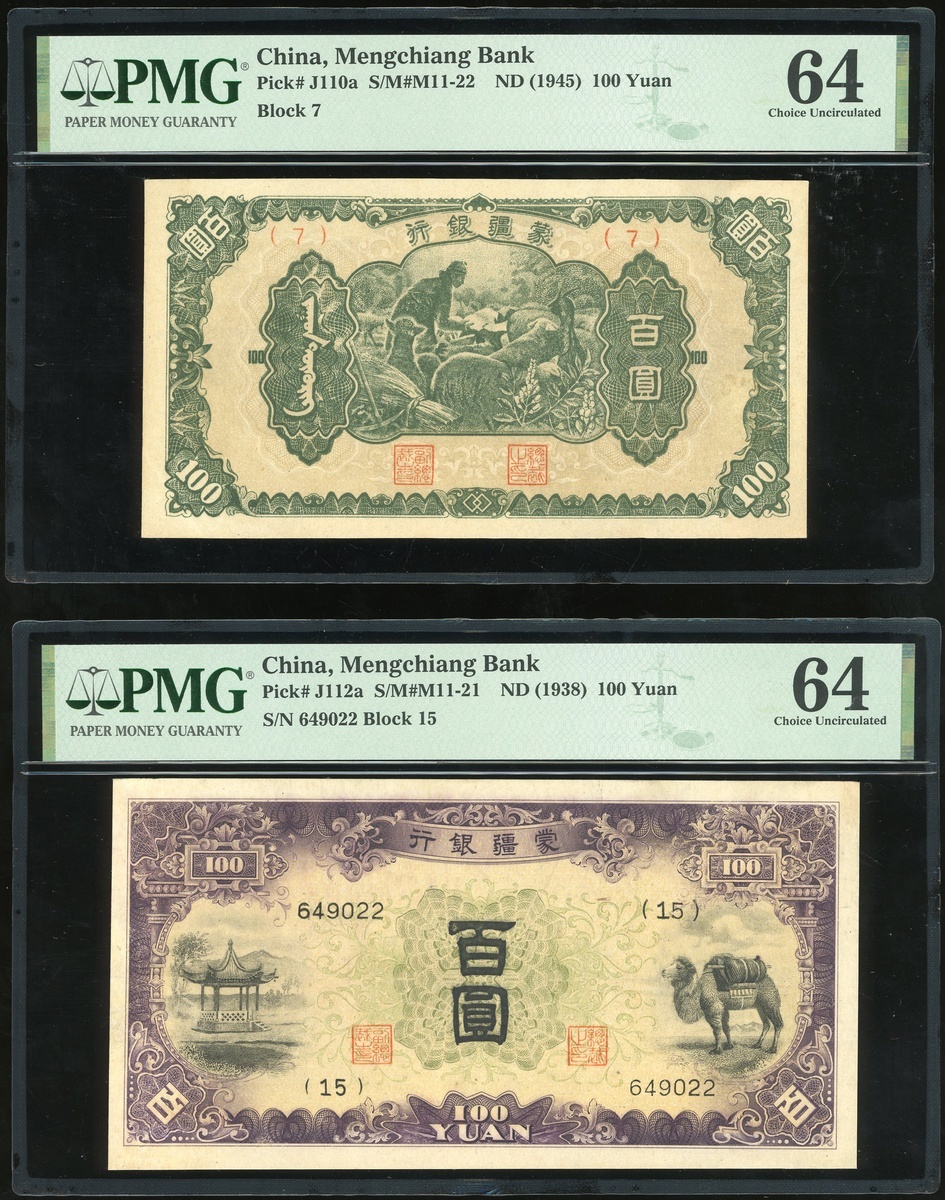Mengchiang Bank, a pair of 100 yuan, ND (1945, 1938), Block 7 and serial number 649022, (Pick J110a, J112a), both graded PMG 64 Choice Uncirculated (2)