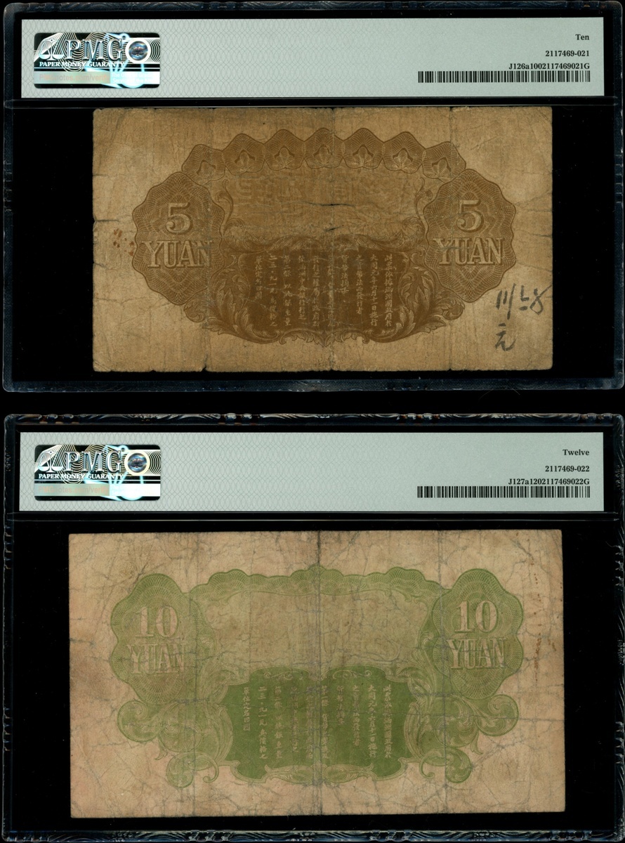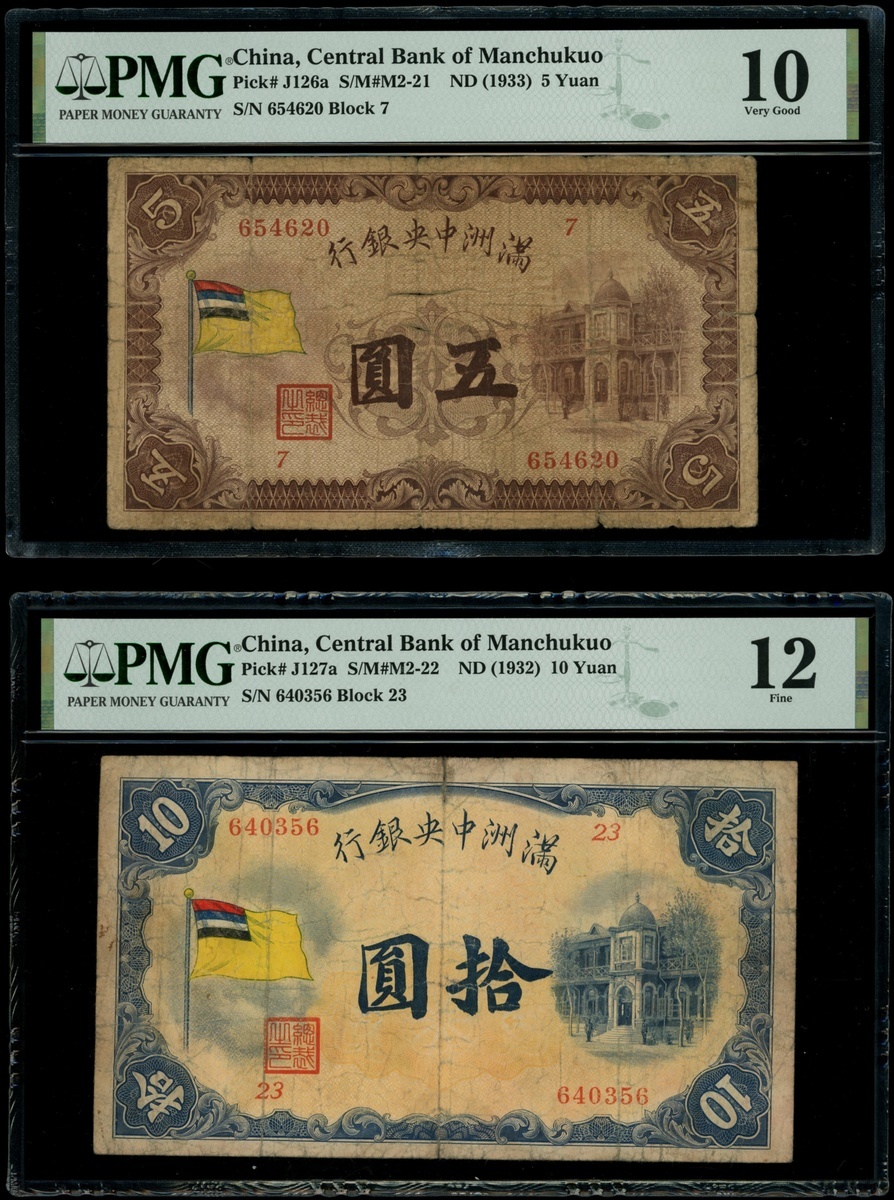 Central Bank of Manchukuo, a lot of 5 yuan, ND(1933) and 10 yuan, ND(1932), serial number 654620 (7) and 640356 (23), (Pick J126a, J127a), PMG 10 Very Good and 12 Fine respectively.(2)