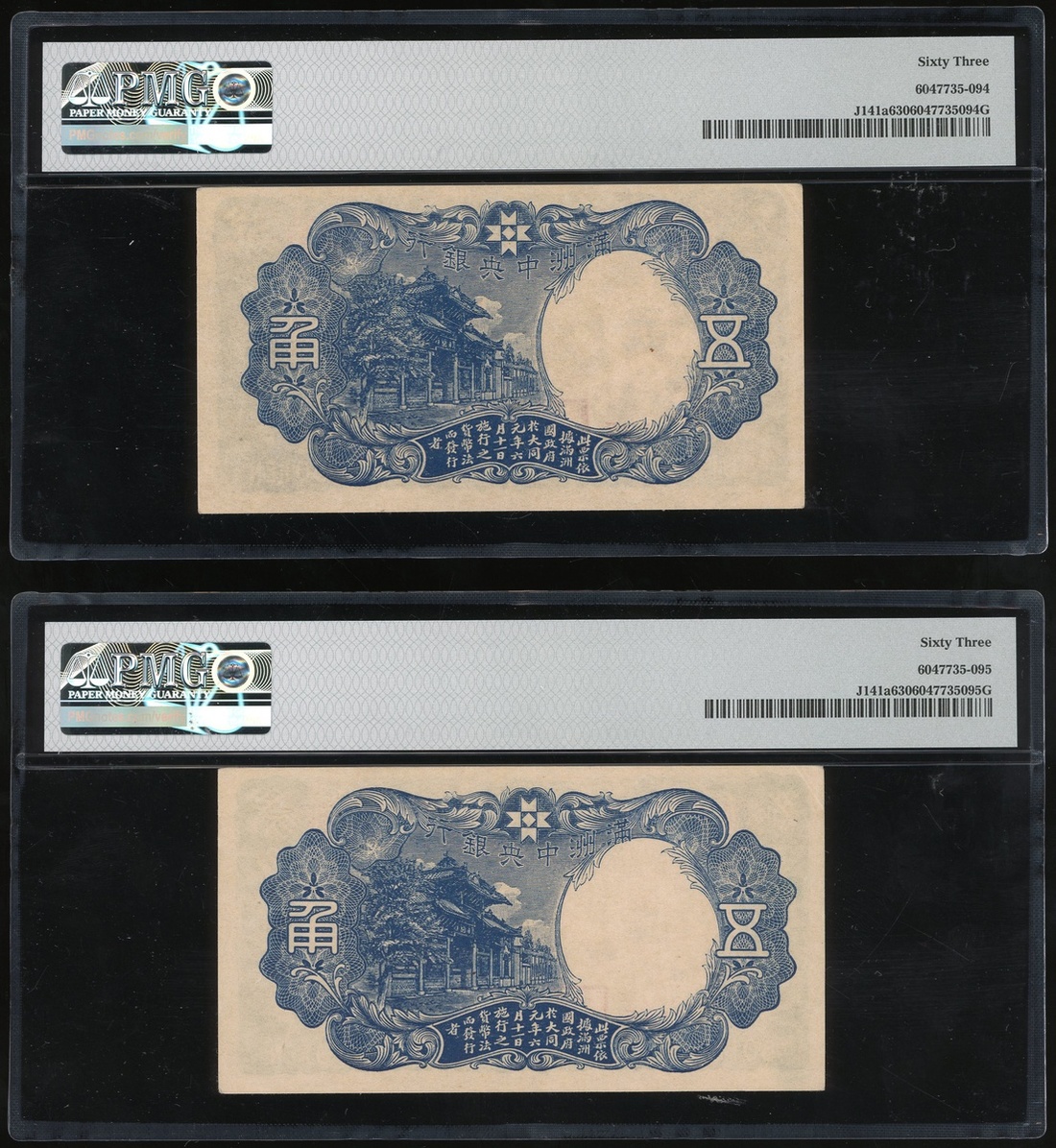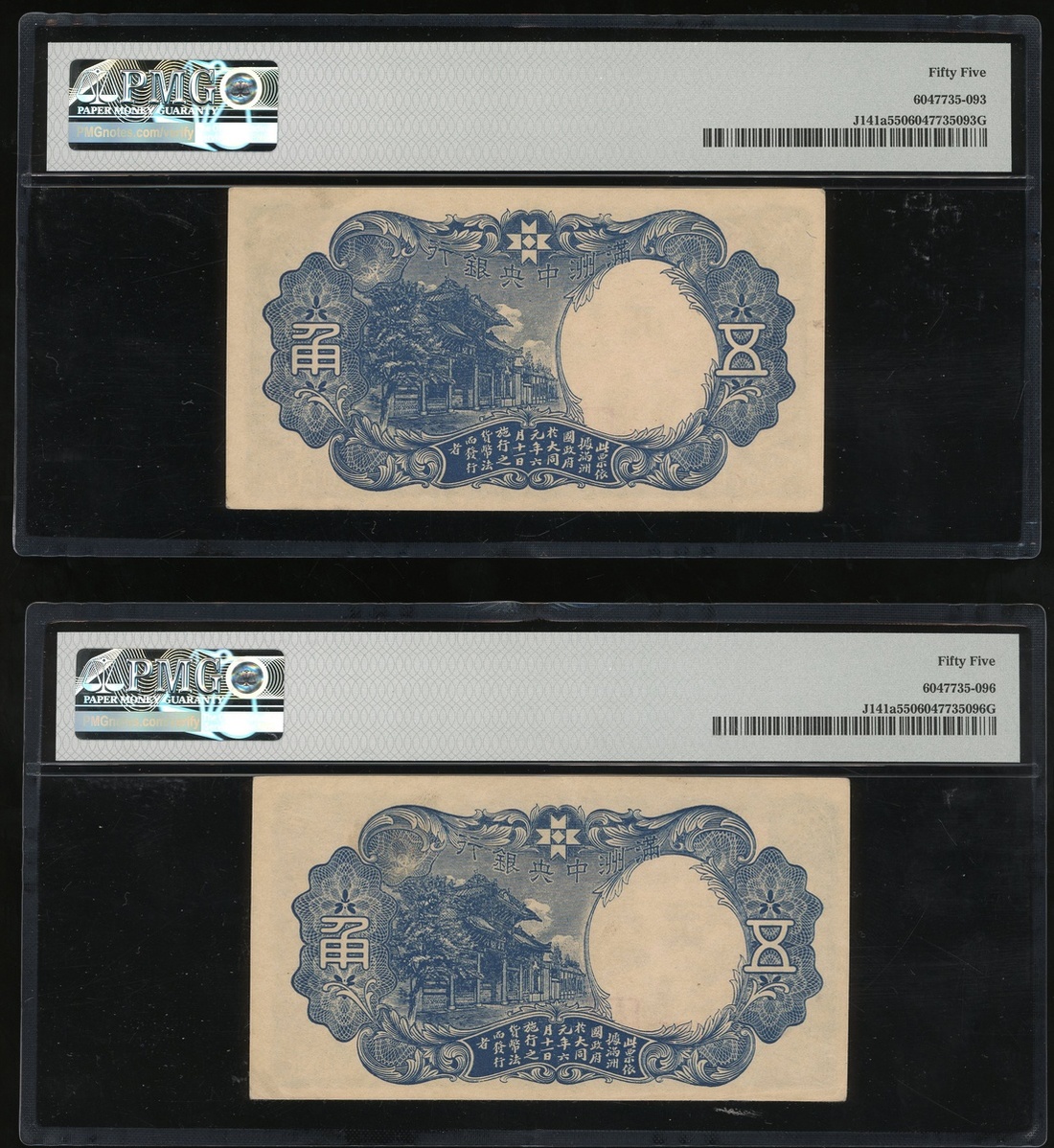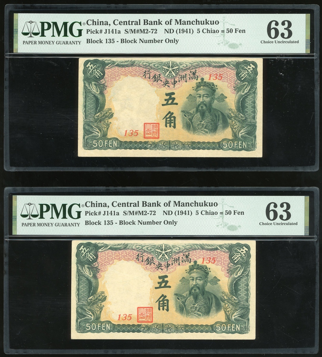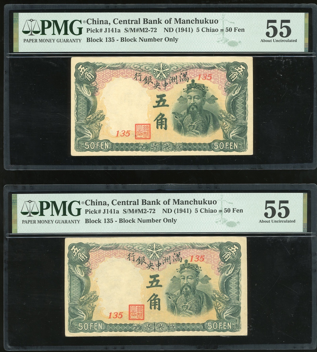 1941年滿州中央銀行一組4枚5角,組號135,兩枚評PMG 64EPQ,另外兩枚評PMG 55