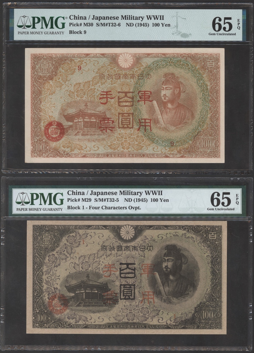 Japanese Invasion Money, lot of 2x different 100 yen, ND (1945), Block 1 and Block 9, (Pick M29, M30), both graded PMG 65EPQ Gem Uncirculated (2)