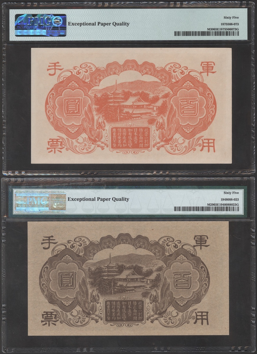 1945年日本軍用手票100円一對,不同版別,組號1跟9,均PMG 65EPQ