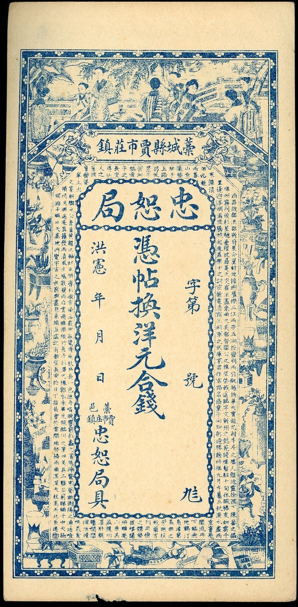 China Private Issue, Chung Shu Ju, Hung Hsien era, remainder without any face value, blue, vertical format, reverse green, (Pick unlisted), about uncirculated, bottom edge damage, viewing highly recommended, sold as is, no returns