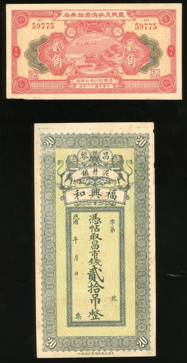 民國年間私鈔一對,民國十六年(1927)農民交換有價證券局貳角,編號59775,及泥井鎮和興福貳拾吊整,無日期,庫存票,前者AU品相,左下角有缺,後者VF品相,右上角有缺,微孔