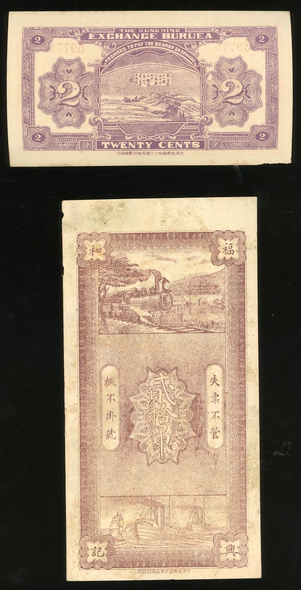 Private Issues, a pair of notes, consists of The Nung Ming Exvhange Buruea, 20 cents, Year 16(1927), serial number 59775, and Fu Xing He, 20 tiao, remainder, (Pick unlisted), the first note almost uncirculated with lower left corner defect and the lattergood very fine with upper right corner defect and very minor pinholes (2)