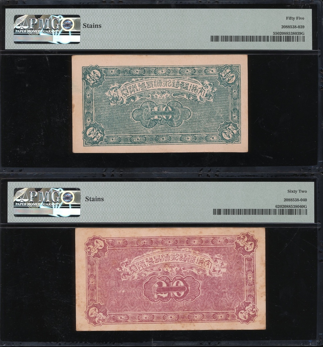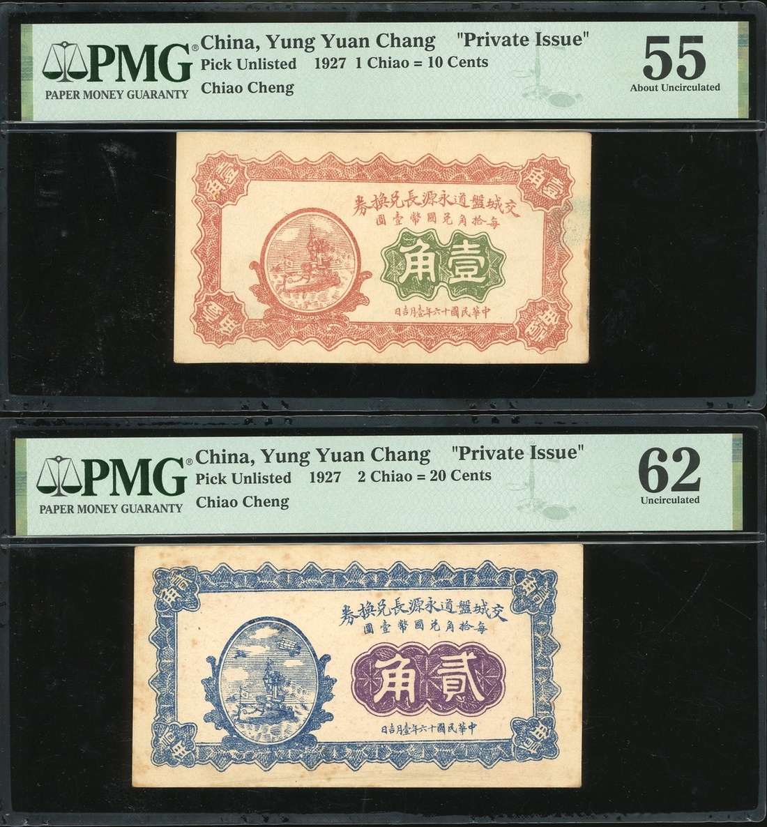 Private Issue: Yung Yuan Chang, 1 chiao and 2 chiao, Year 16 (1927), without serial numbers, (Pick Unlisted), PMG 55 About Uncirculated (Stains) and 62 Uncirculated (Stains) (2)