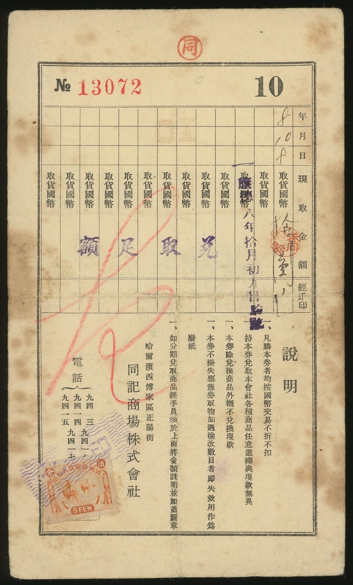 Private Issue, group of 4, consisting of: Tong Ji Mall, Harbin, 10 yuan commodity coupon, number 13072, with a Manchurian government revenue stamp 5 fen on reverse bottom left, also Yong Shun company, 3x 1 tiao, 1928, serial number 0729-31,