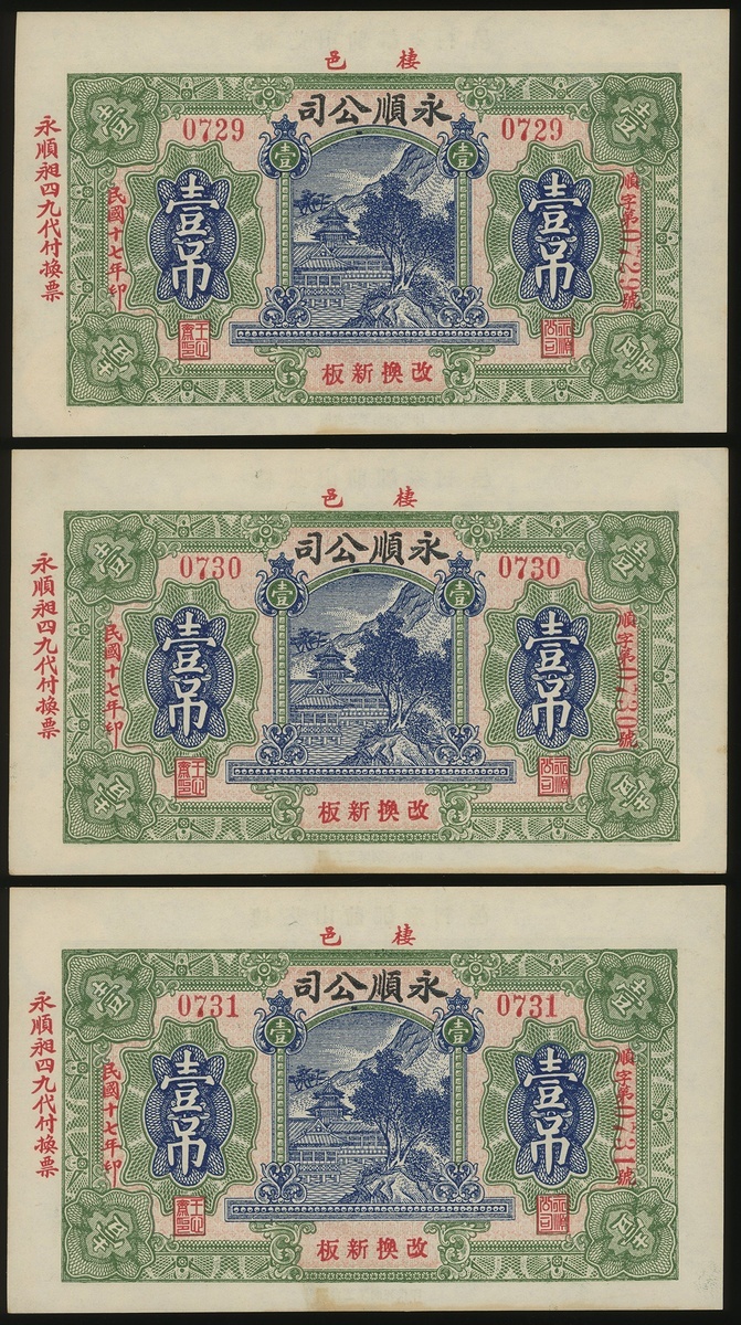 私鈔一組4枚,包括哈爾濱同記商場商品券10元,以及1928年永順公司1吊三枚,首枚GVF品相,有污漬,其後三枚UNC,印刷精美,紙邊有微黃