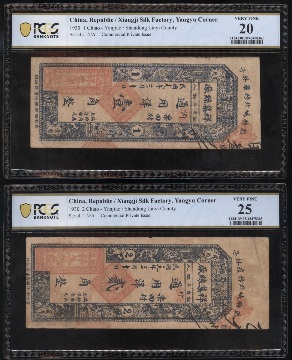 民國十九年山東祥集絲廠壹、貳角各一枚,PCGS Banknote 20-25