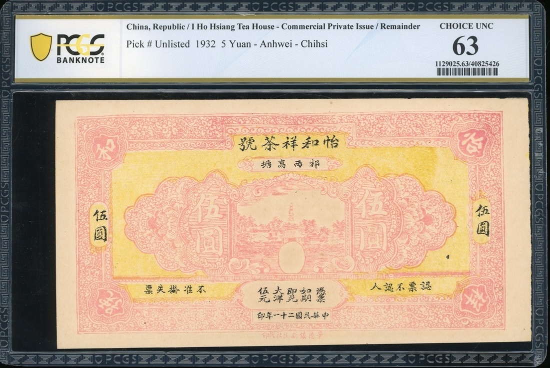 Republic of China, Private Issue, I Ho Hsiang Tea House, 5 yuan, remainder, Anhwei-Chihsi, Year 21(1932), (Pick unlisted), PCGS Banknote 63 Choice UNC.