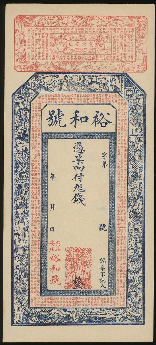 清代錢莊票裕和號未流通鈔票,直式設計,保存良好,紙邊微黃,AU至UNC,罕有