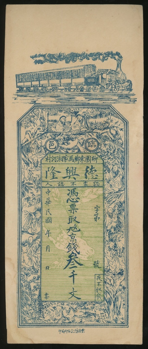 民國三十年代德興隆叄仟文,庫存票,AU品相,有黃