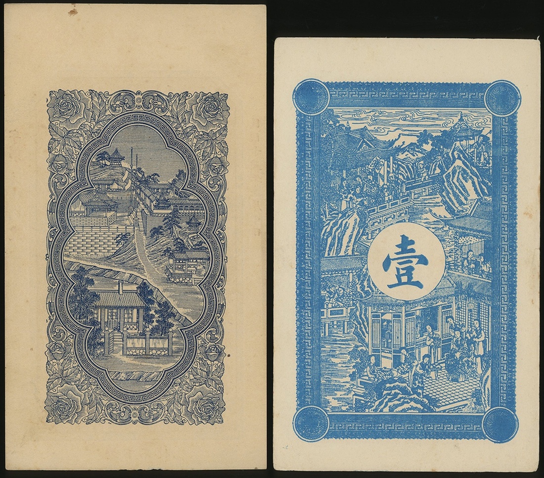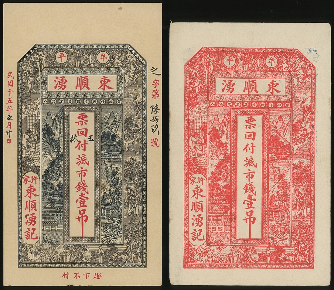 Private Issue, a pair of 'Dong Shun Yong', 1 tiao, one without date and number, common printing, the other dated 1926, number 69, fine and detailed print,
