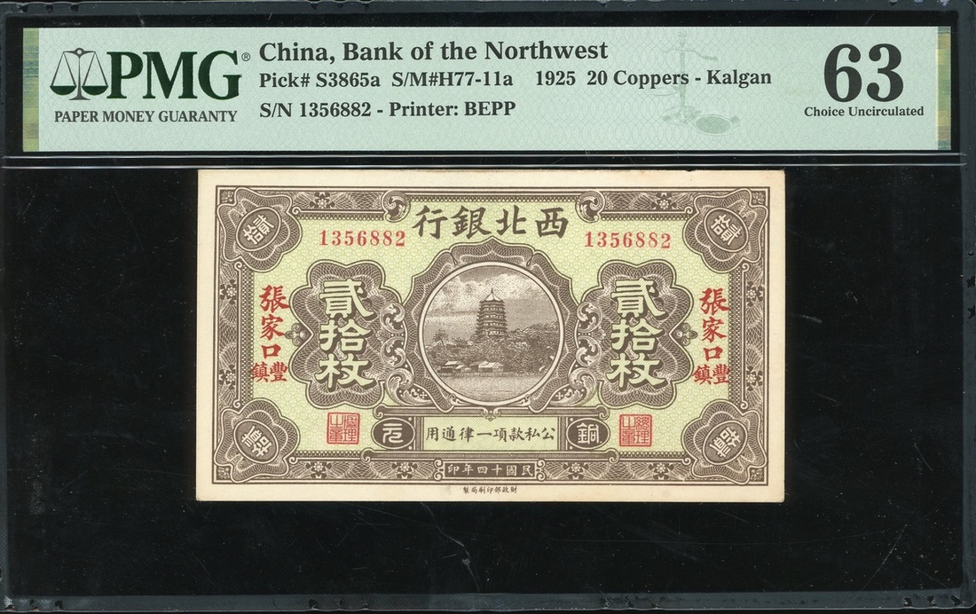民國十四年(1925)西北銀行貳拾枚,張家口地名,編號1356882,PMG 63