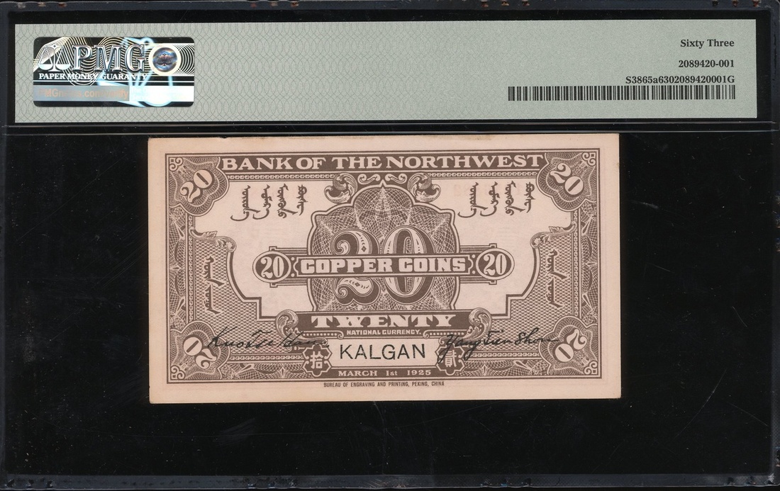 Bank of the Northwest, 20 coppers, Kalgan, Year 14(1925), serial number 1356882, (Pick S3865a), PMG 63 Choice Uncirculated.