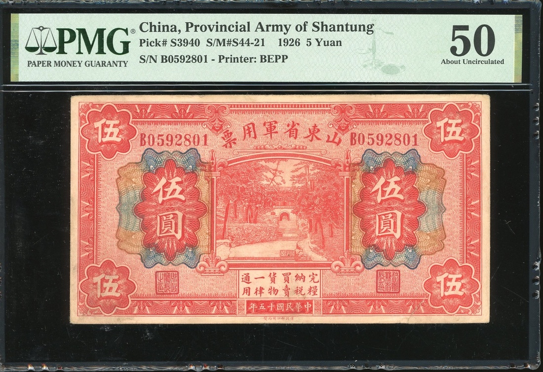 民國十五年(1926)山東省軍用票伍圓,編號B0592801,PMG 50(有裂)