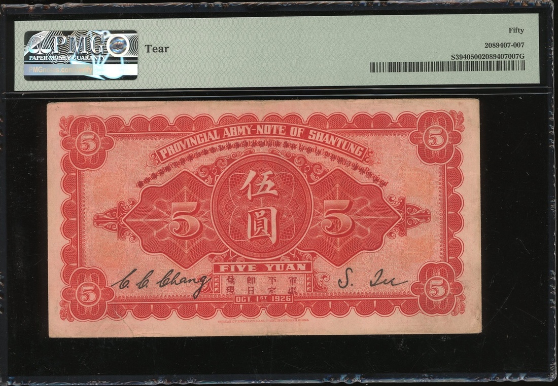 Provincial Army of Shantung, 5 yuan, Year 15 (1926), serial number B0592801, (Pick S3940), PMG 50 About Uncirculated (Tear)