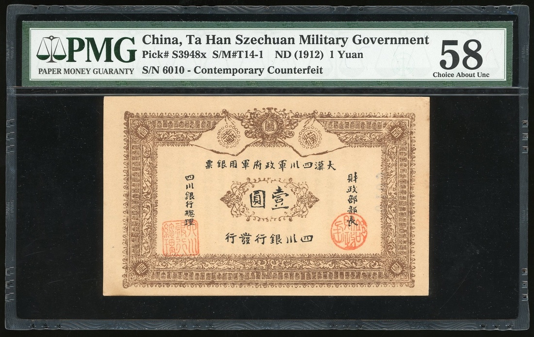 Ta Han Szechuan Military Government, 1 Yuan, 1912, serial number 6010, brown and black, flags at top centre, CONTEMPORARY COUNTERFEIT, (Pick S3948x), PMG 58 Choice About Uncirculated