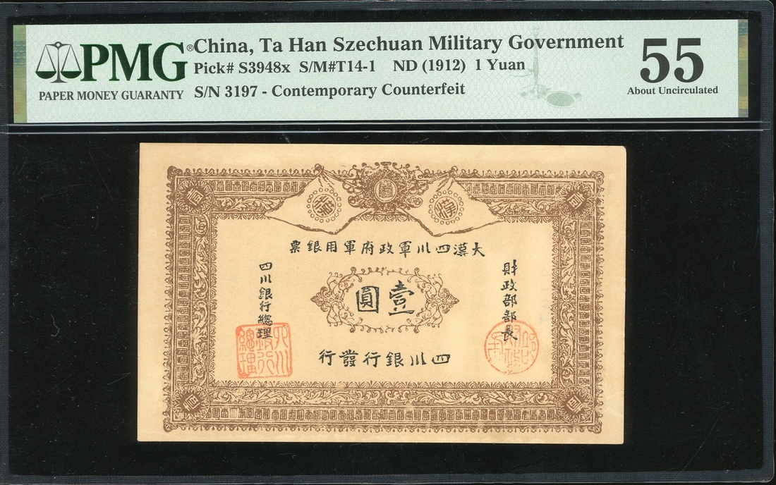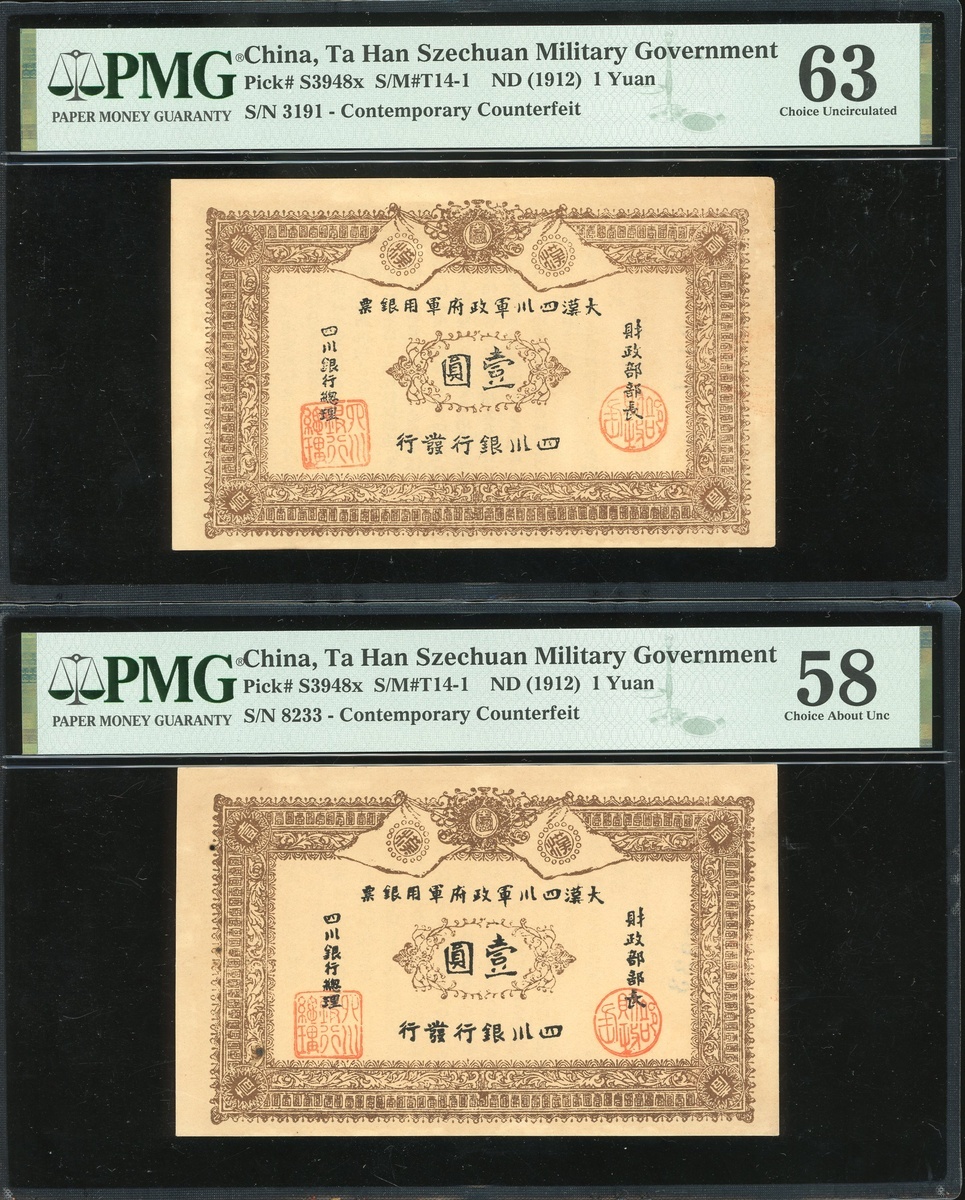 Ta Han Szechuan Military Government, a trio of 1 yuan, 1912, serial numbers 3191 and 8233 and 3197, CONTEMPORARY COUNTERFEIT, (Pick S3948x), graded PMG 63, 58 and 55 respectively (3).