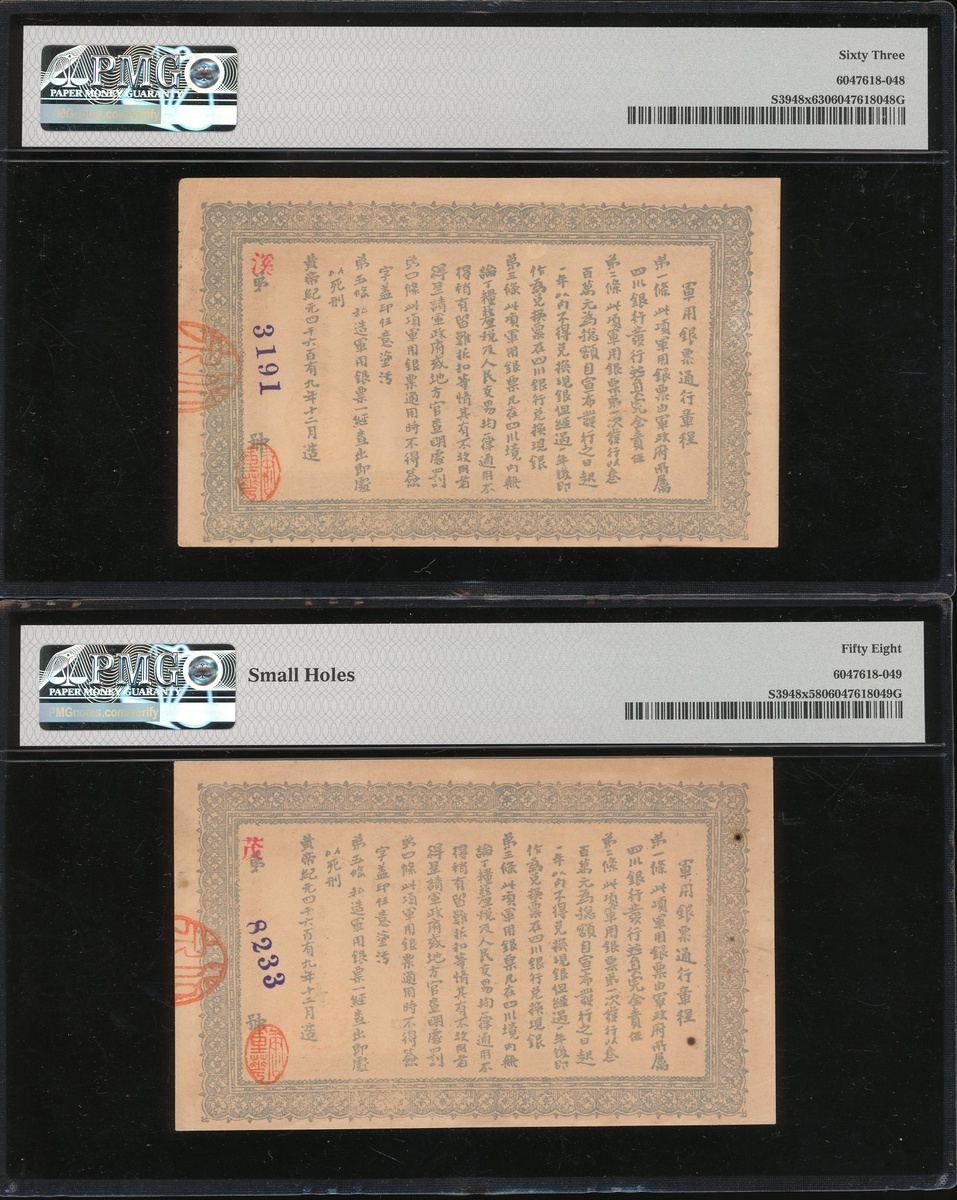 民國元年大漢四川軍政府軍用銀票壹圓老假票一組三枚,編號3191,8233及3197,分別評PMG 63, 58 及55