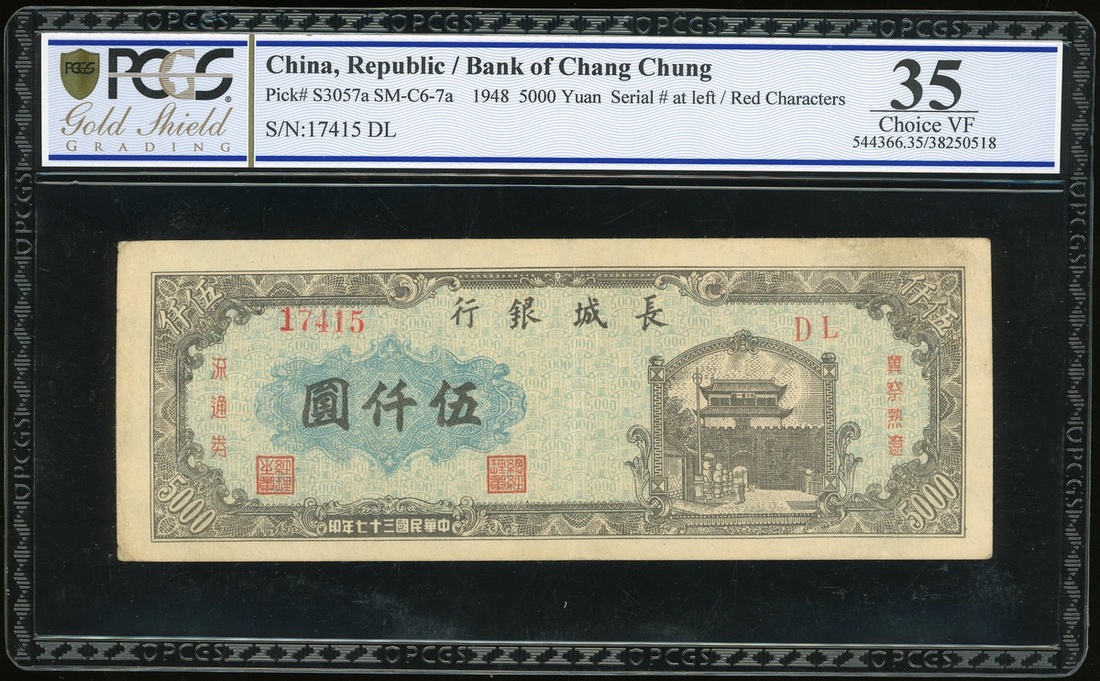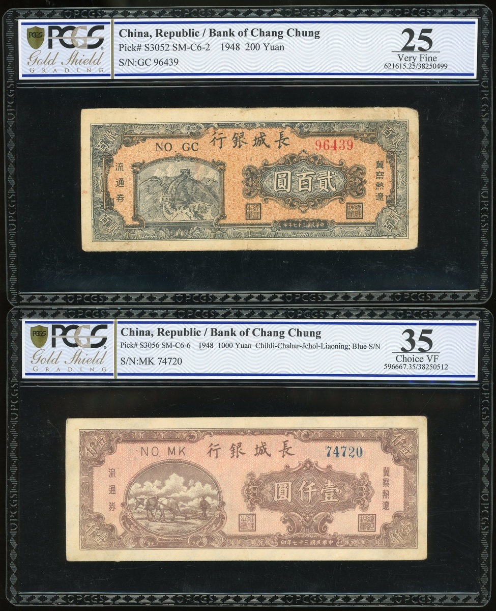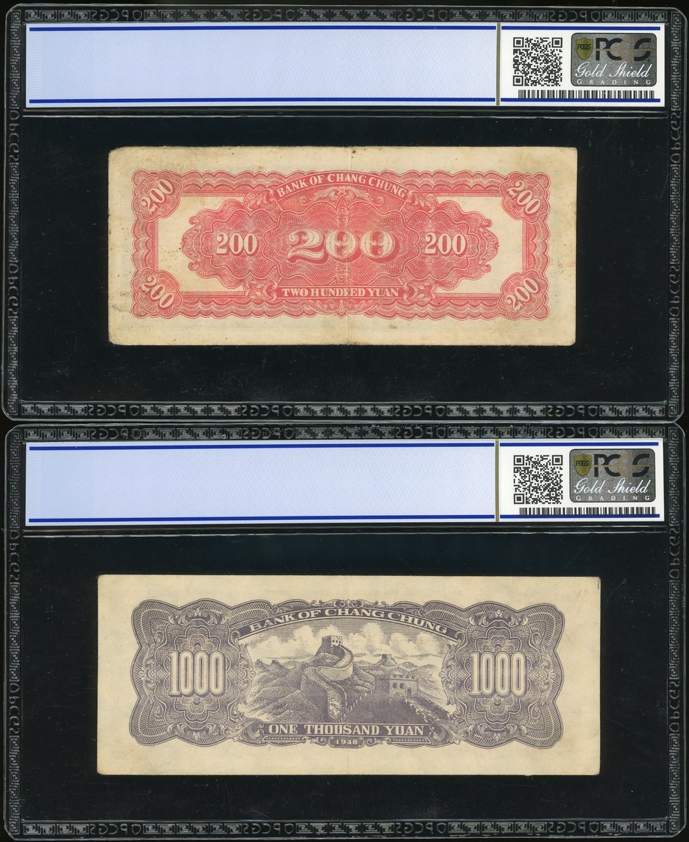 Bank of Chang Chung, 200, 1000 and 5000 Yuan, 1948, serial numbers GC96439, MK74720 and 17415DL, dark blue, brown and grey respectively, (Pick S3052, S3056, S3057a), PCGS Gold Shield 25 Very Fine-35 Choice Very Fine (3)