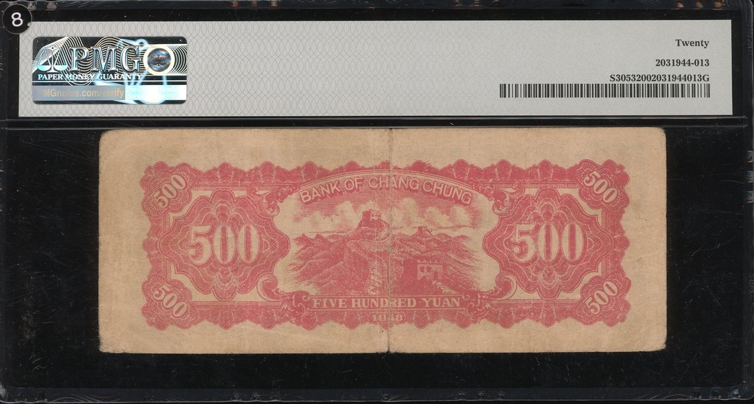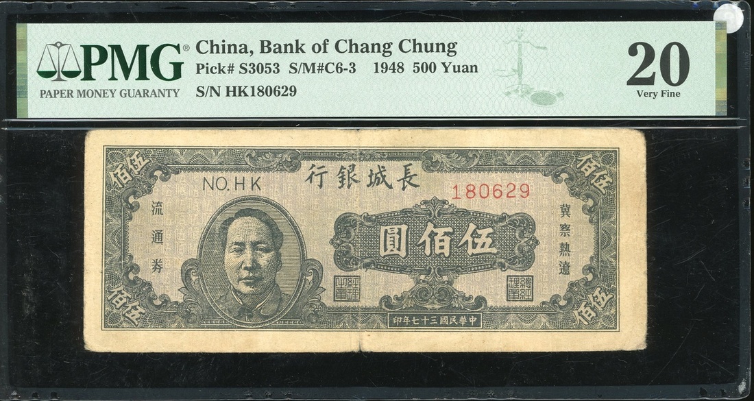 Bank of Chang Chung, 500 yuan, 1948, serial number HK180629, black, Mao Zedong at left,