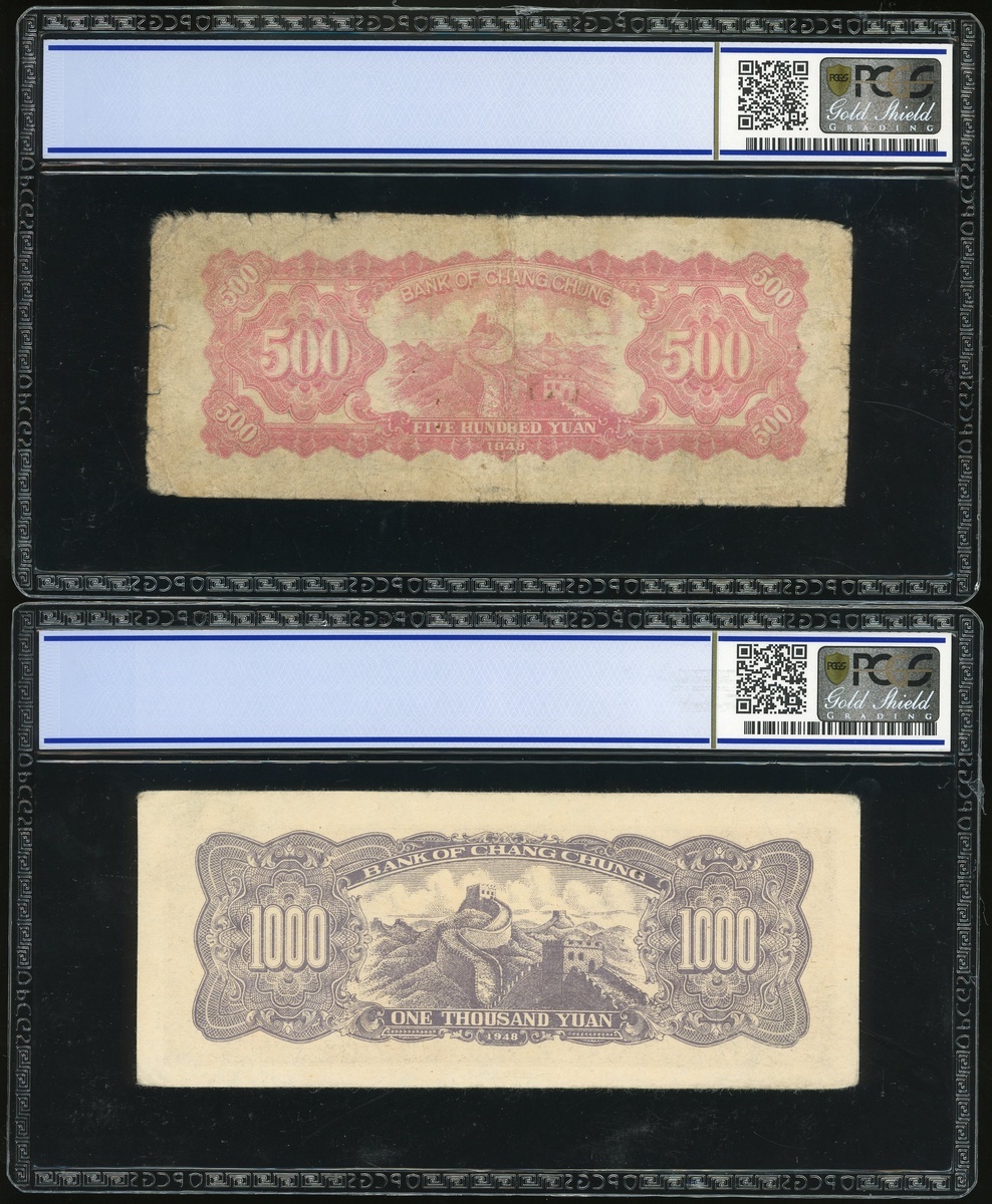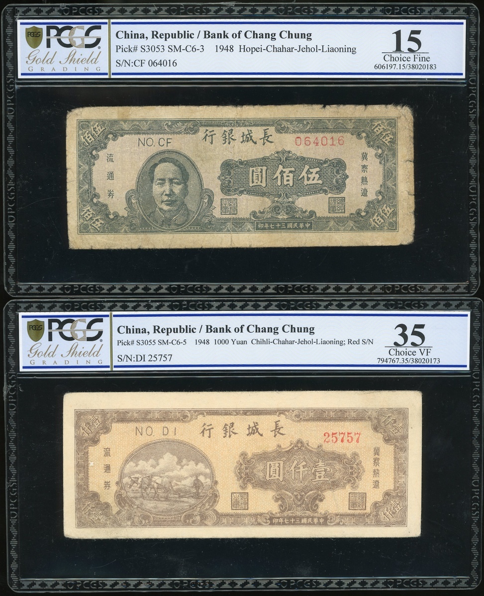 民國三十七年長城銀行伍佰、壹仟圓一組兩枚,編號CF064016及DI25757,PCGS Gold Shield 15-35