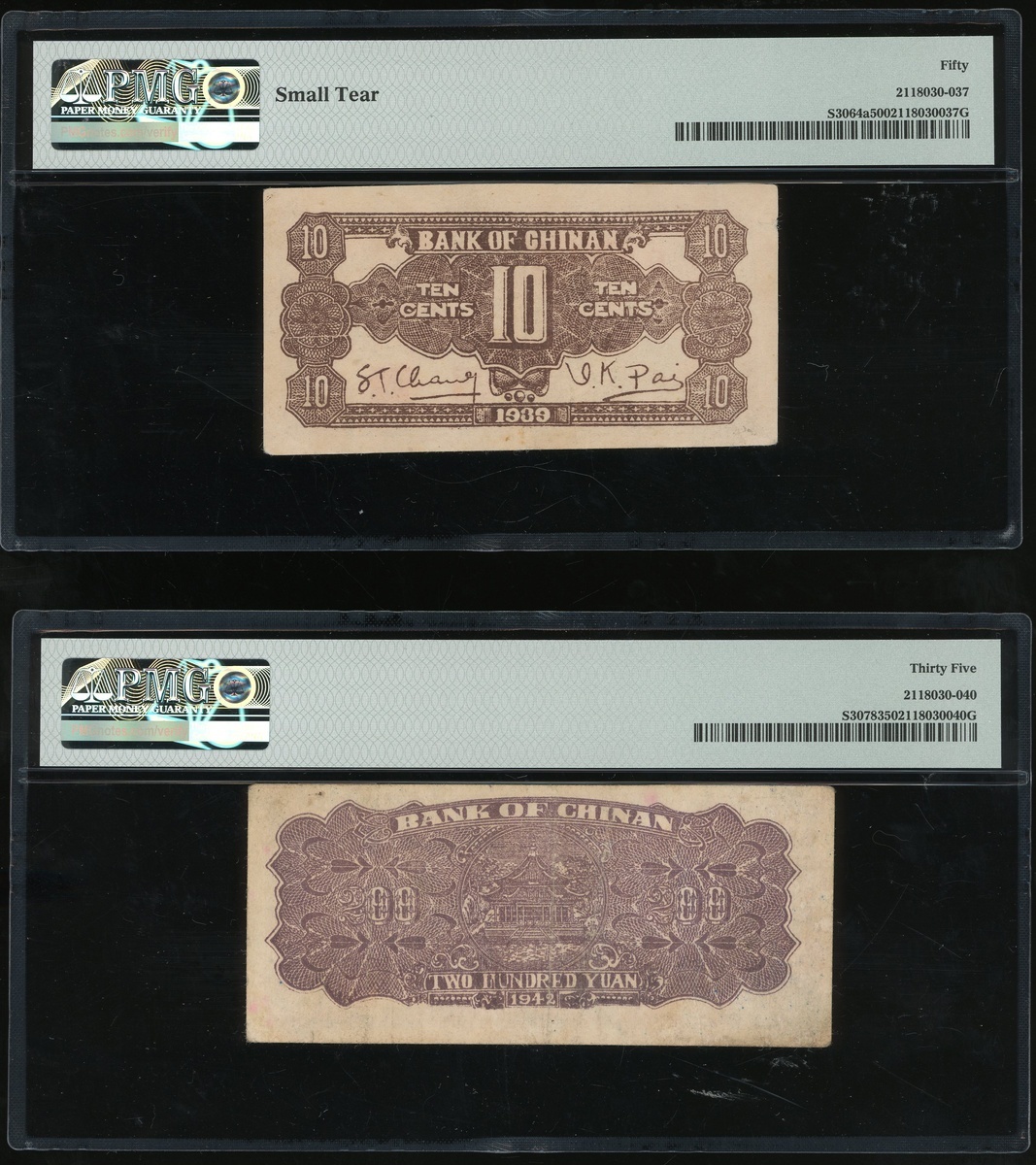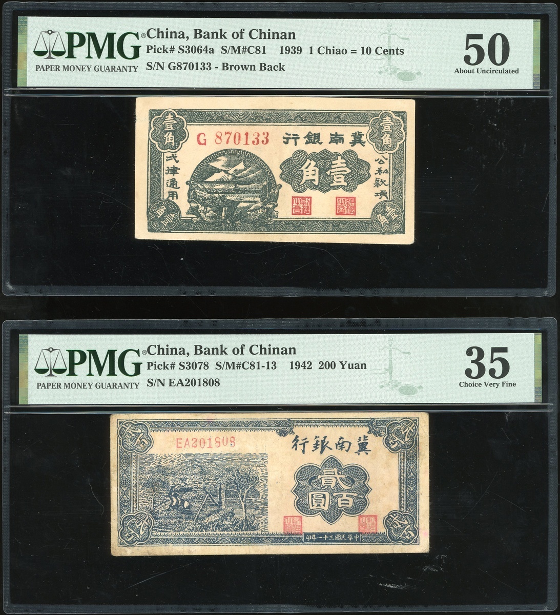 Bank of Chinan, group of 2, consisting of: 1 chiao, 1939, serial number G870133 and 2 yuan, Year 31 (1942), serial number EA201808, (Pick S3064a, S3078), graded PMG 50 (Small Tear) and 35 respectively (2)