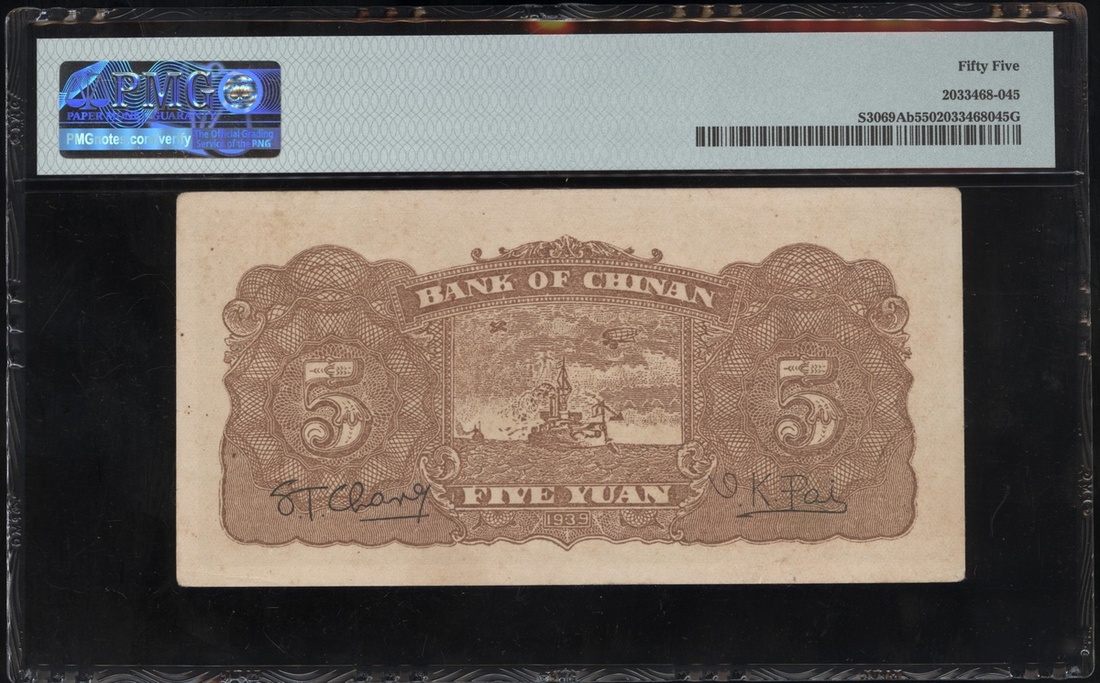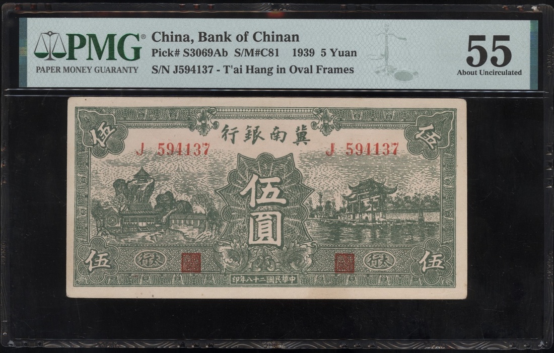 Bank of Chinan, 5 Yuan, 1939, serial number J594137, green, Tai Hang, reverse brown, (Pick S3069Ab), PMG 55 About Uncirculated