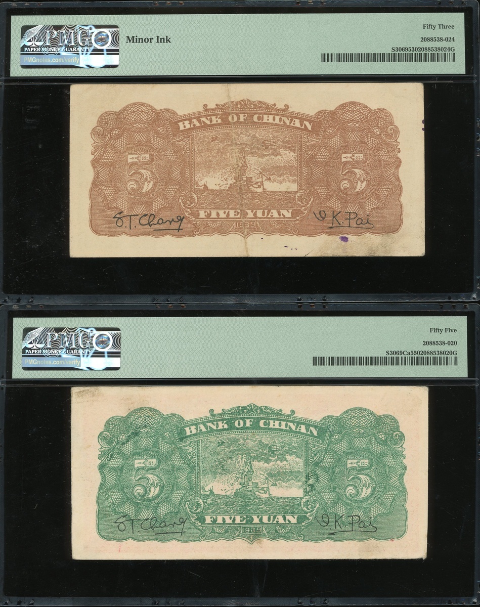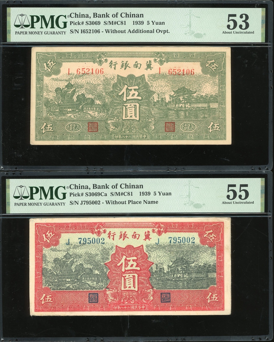 民國二十八年(1939)冀南銀行伍圓一對,太行地名及無地名,編號I652106及J795002,評PMG 53(輕微墨漬)及PMG 55