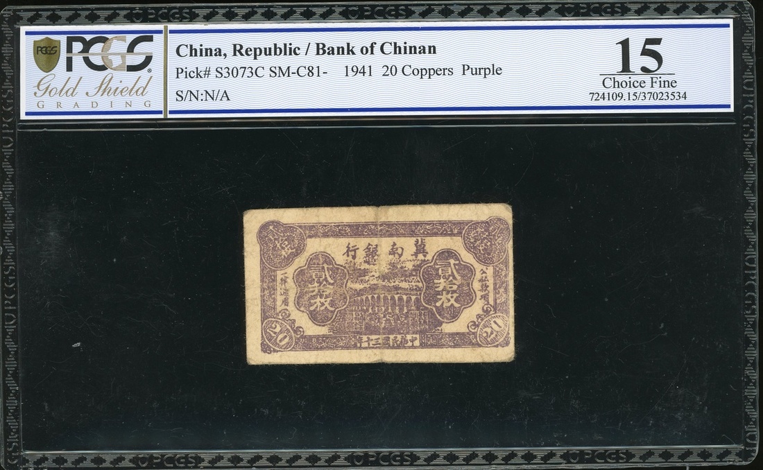 Bank of Chinan, 20 Coppers, 1941, purple, bridge at centre, (Pick S3073C), PCGS Gold Shield 15 Choice Fine