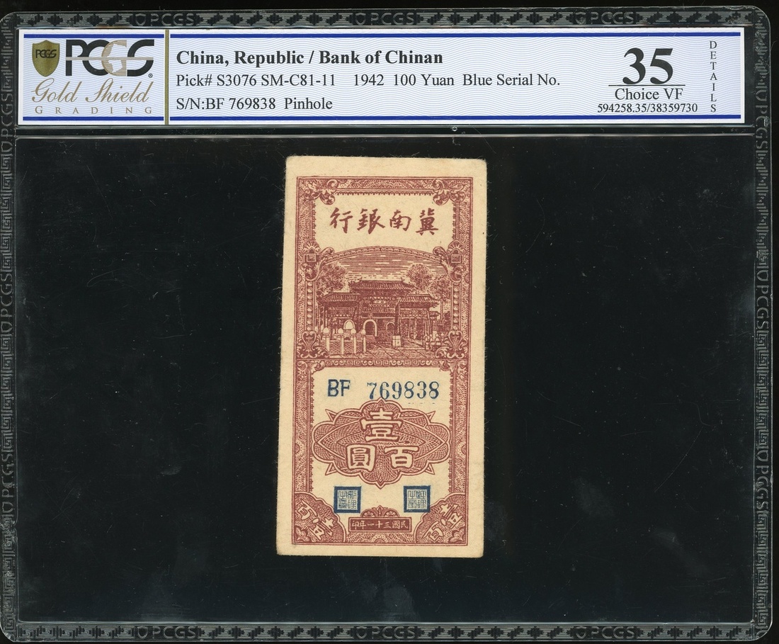 Bank of Chinan, 50 and 100 Yuan, 1942, serial numbers D1101029 and BF769838, brown, reverse blue, (Pick S3075, S3076), PCGS Gold Shield 35 DETAILS (Pinhole)-40 Extremely Fine (2)