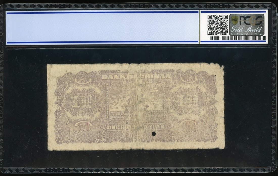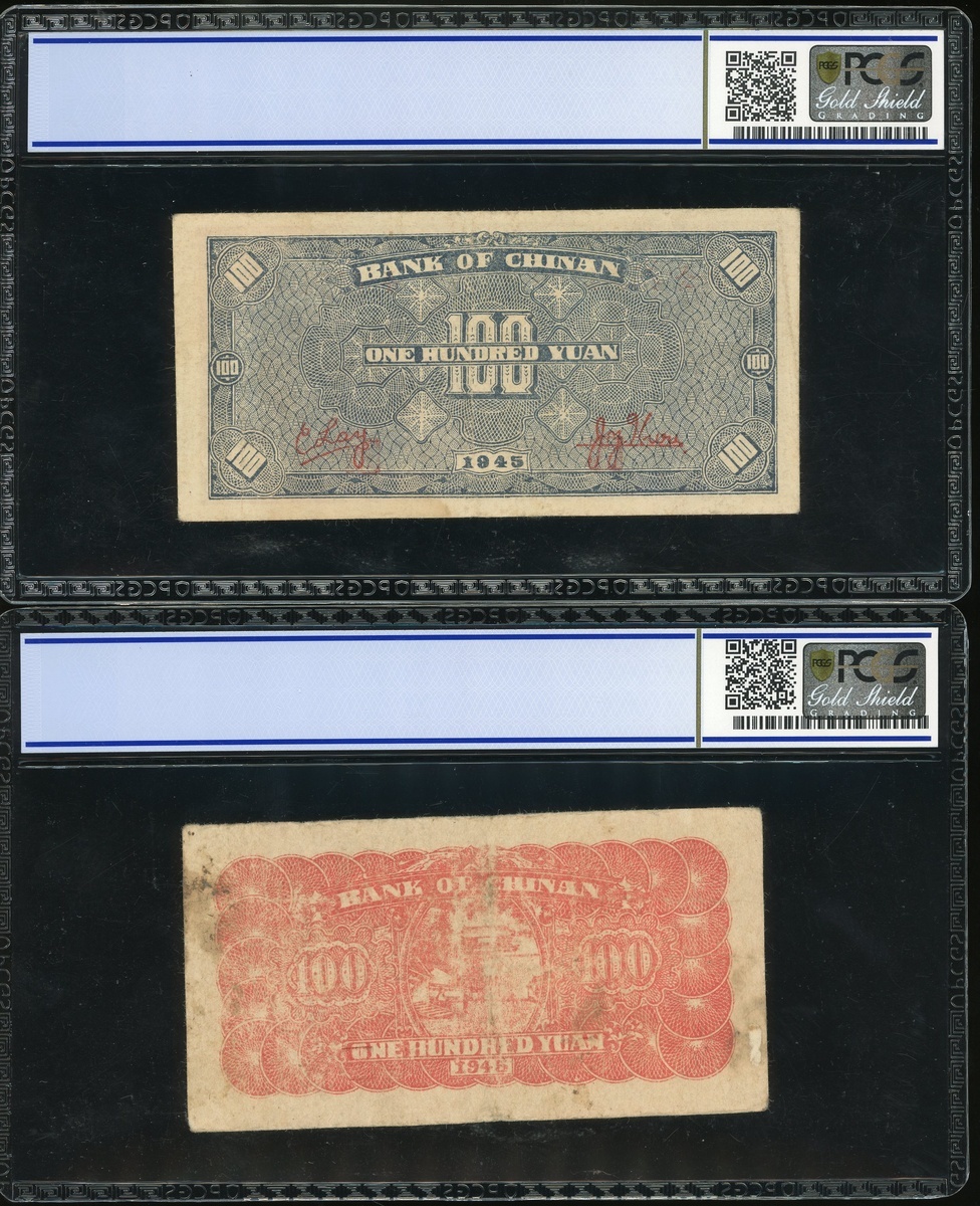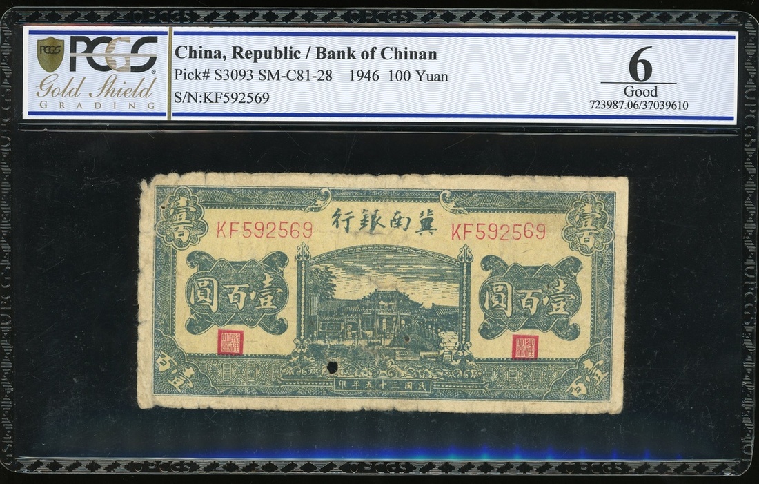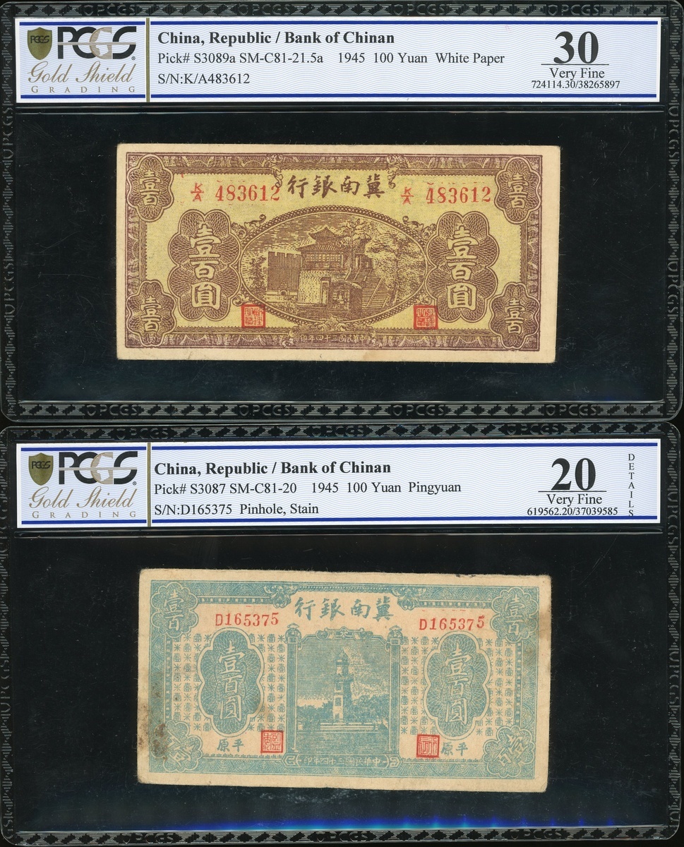 Bank of Chinan, 100 Yuan, 1945 (2) and 1946, serial numbers K/A 483612, D165375 and KF592569, green and brown, (Pick S3087, S3089a, S3093), PCGS Gold Shield 6 Good-30 Very Fine (3)