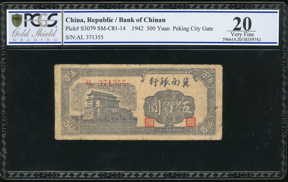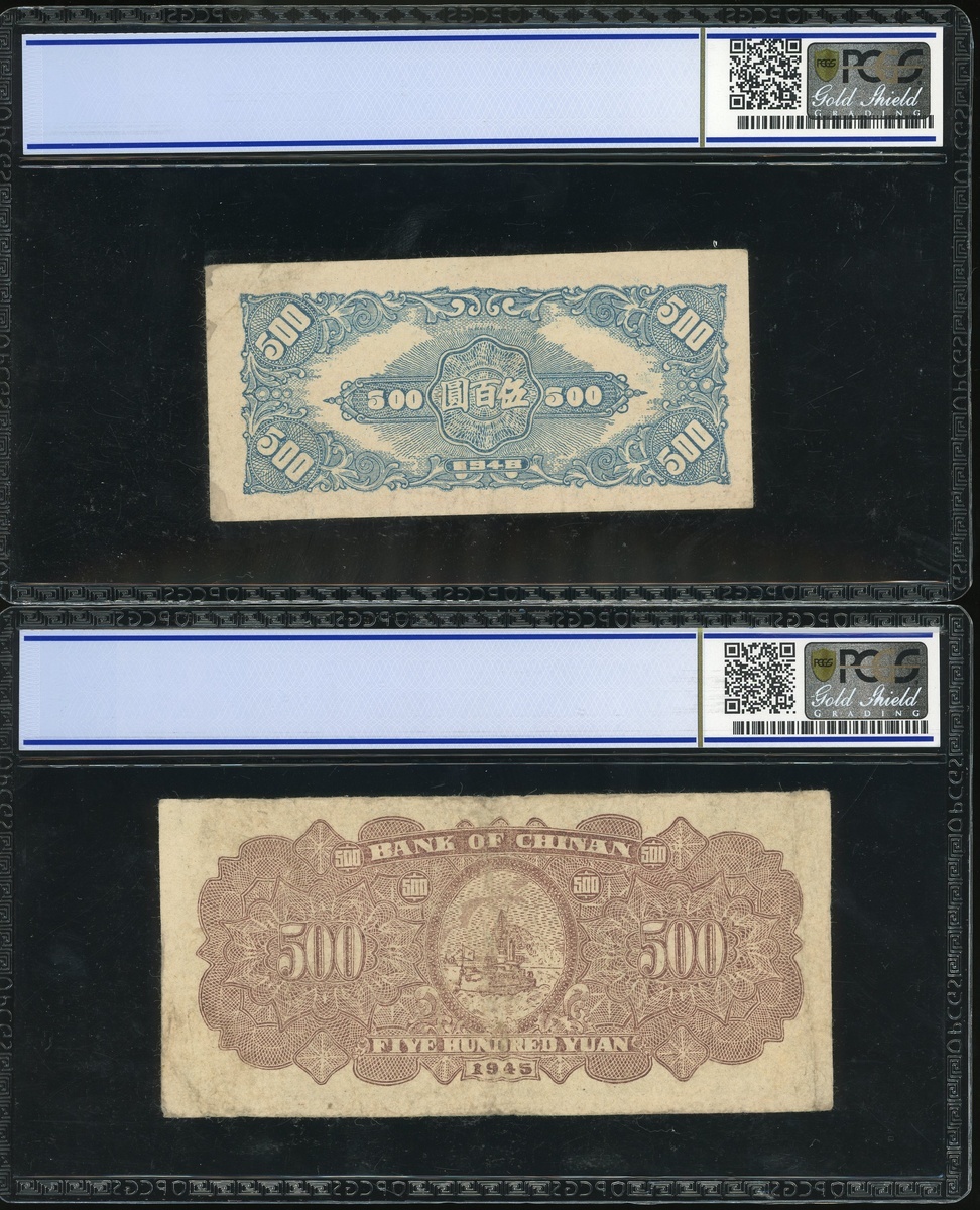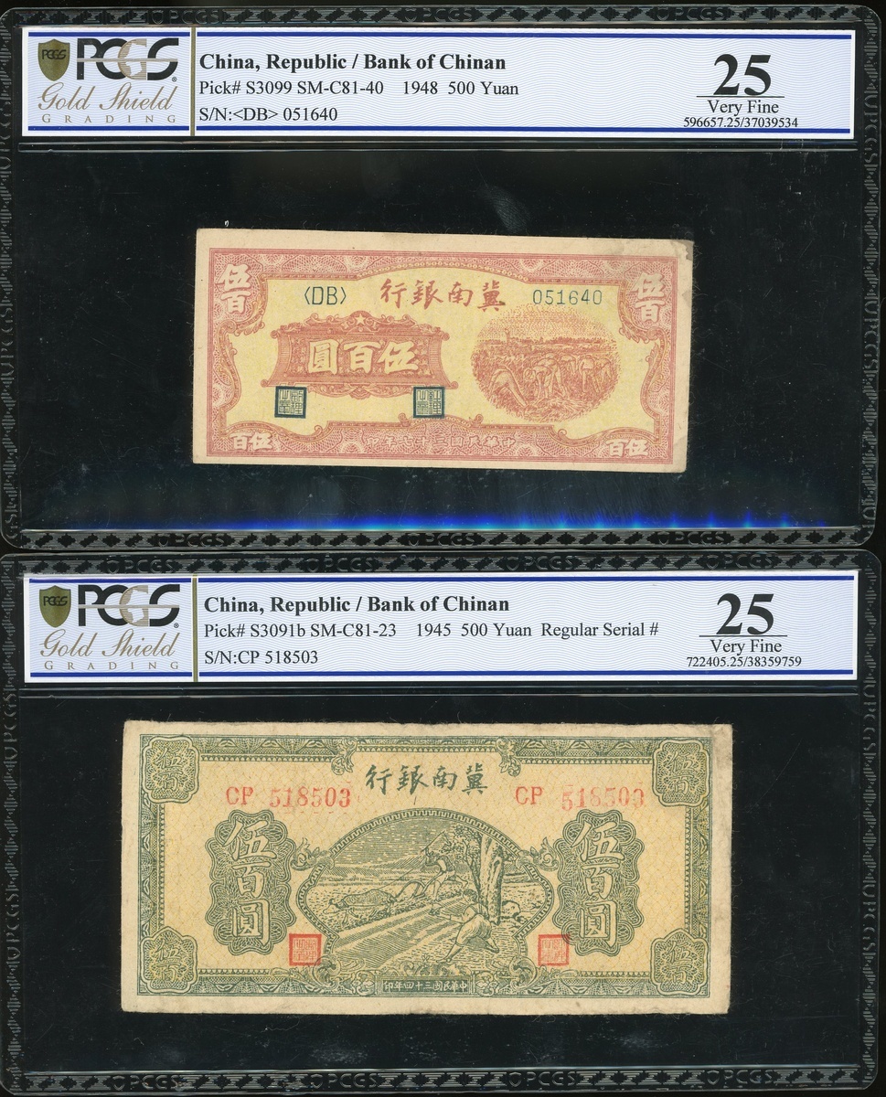 Bank of Chinan, 500 Yuan, 1942, 1945 and 1948 issues, serial numbers AL371355, CP518503 and DB051640, blue, green and red respectively, (Pick S3079, S3091b, S3099), PCGS Gold Shield 20-25 Very Fine (3)