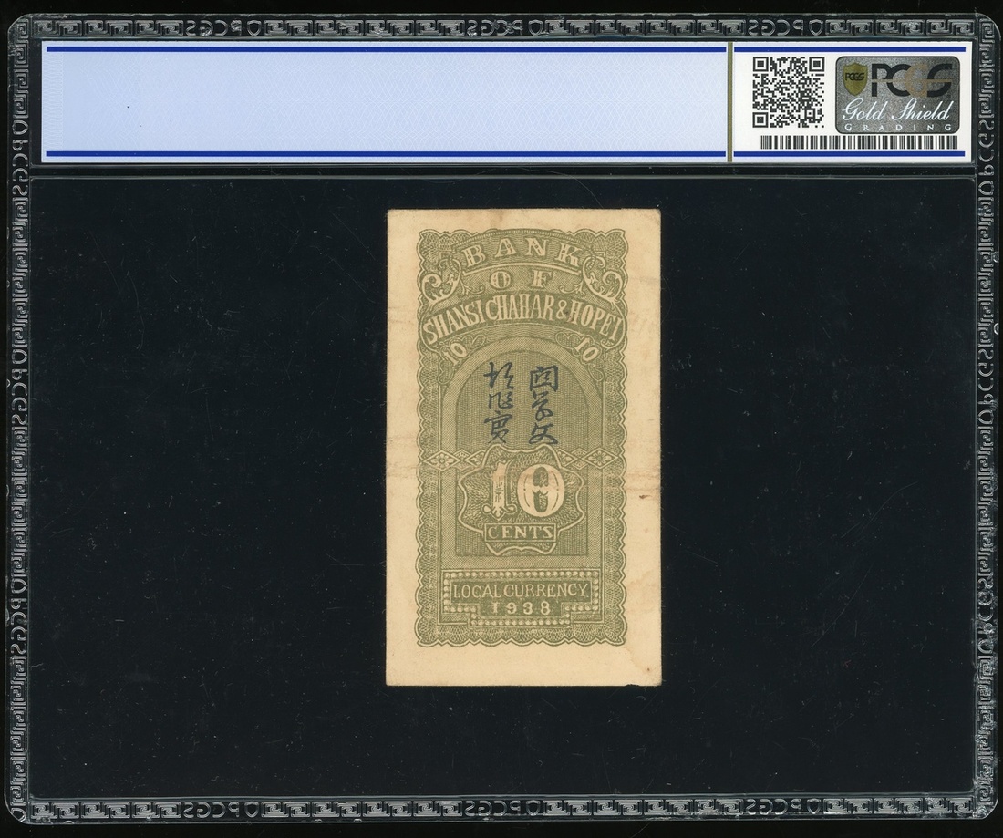 Bank of Shansi, Chahar and Hopei, lot of 3 10 Cents and 50 Cents, 1938, 20 Cents, 1940, serial numbers H996442, D296782 and Q480833, brown and purple respectively, (Pick S3136, S3151, S3138), PCGS Gold Shield 35 DETAILS (Pinholes)-40 Extremely Fine (3)