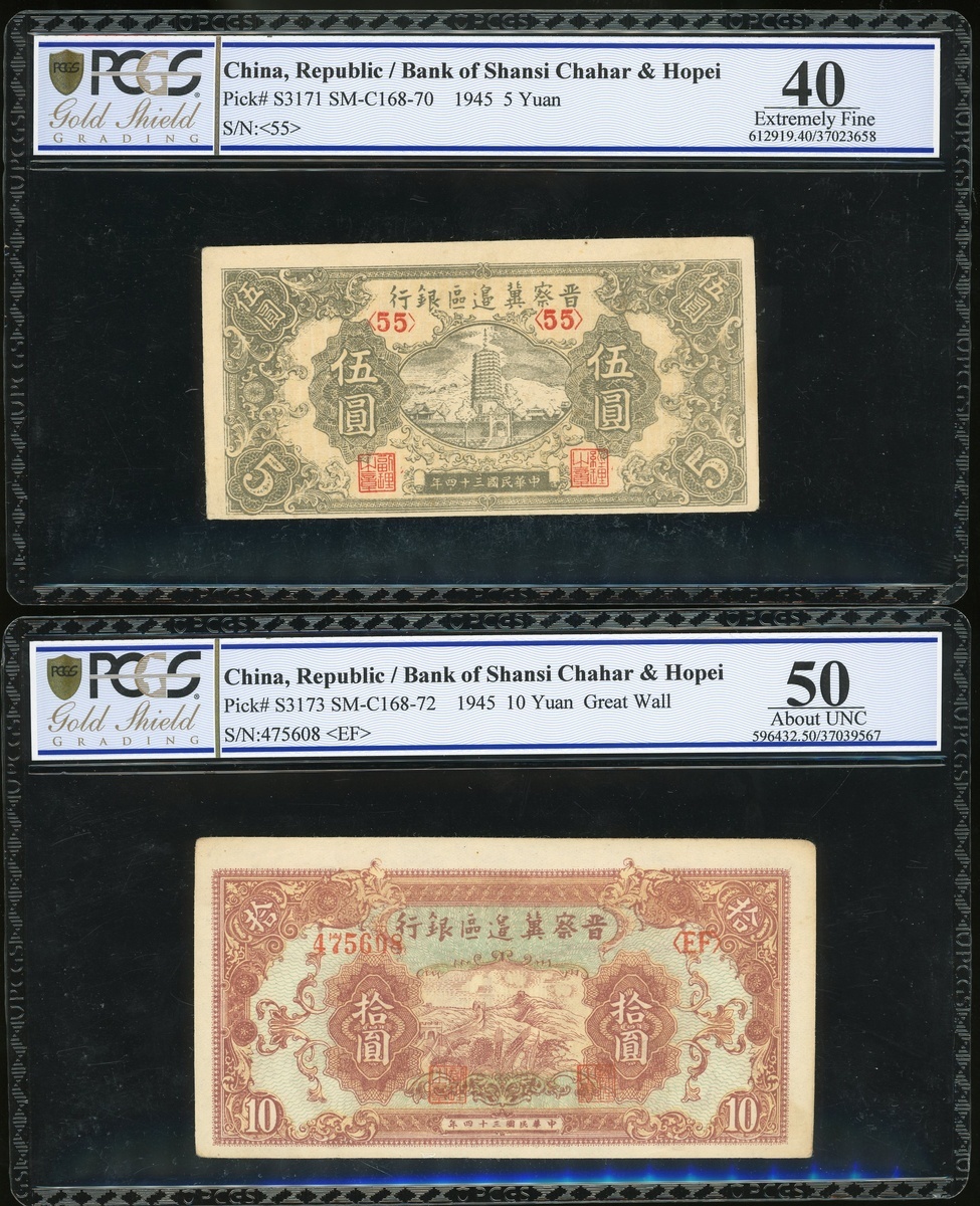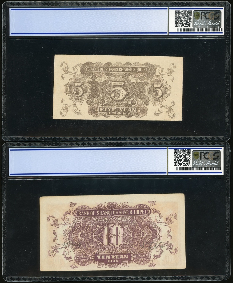 Bank of Shansi, Chahar and Hopei, 5 and 10 Yuan, 1945, green and brown respectively, reverse brown and purple, (Pick S3171, S3173), PCGS Gold Shield 40 Extremely Fine-50 About Uncirculated (2)